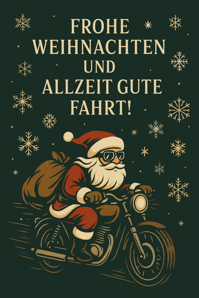 Wir wünschen euch frohe Festtage, entspannte Stunden mit euren Liebsten und einen guten Start ins neue Jahr. Möge 2026 euch viele sichere Kilometer, spannende Touren und unvergessliche Momente auf zwei Rädern bringen.
