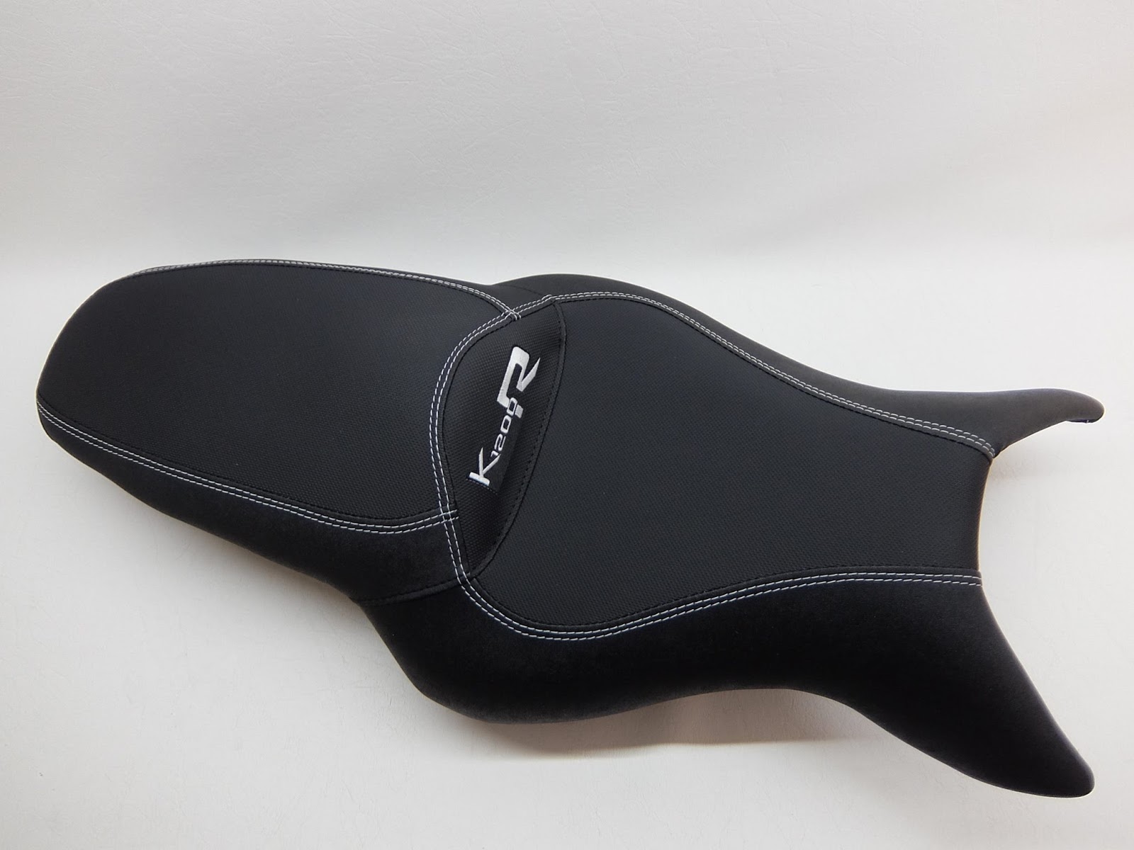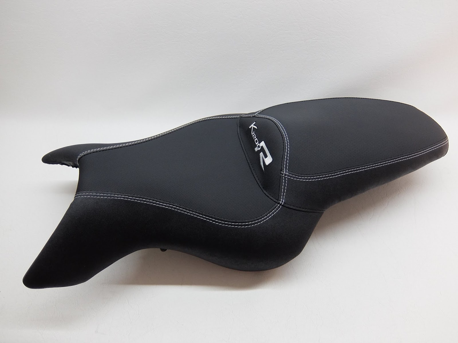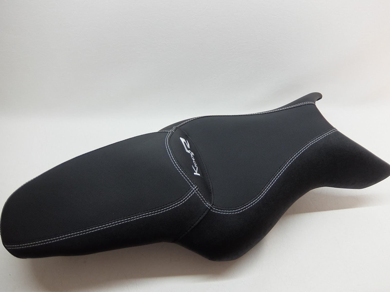 Sitzbank komplett neu bezogen in Antirutsch und Nubuck mit einer körperspezifischen Komfortpolsterung inkl. Gel‑Aktivmatte, Lendenstützeneinbau + Aufrutschkeil für die Sozia. Stickerei und doppelte Ziernähte in Weiß.