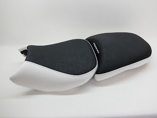 Fahrer und Soziussitz mit kompletten Neubezug in Nubuck und Classic-Weiß mit einer körperspezifischen Komfortpolsterung incl. einer Gel-Aktivmatte neugepolstert. 1cm abgepolstert und die Soziusstirn mit