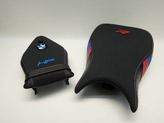 Neubezug in Antirutsch, Carbon, mit Einlegestreifen in Blau/Rot – wechselseitige Ziernaht Blau/Rot, mehrfarbige Stickereien. Mit