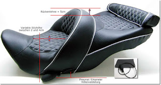 Beispiel einer Honda GoldWing GL1800 Sitzbank, in dieser Ausführung wurde die Fahrerrückenlehne um 5 cm erhöht  Mit dem Einbau eines Pneumat-Erkameter kann eine Höhenverstellung in den Bereichen zwischen 2-4cm vorgenommen werden, was den Knieschluß insbesondere bei längeren Strecken entlastet. Ausführung: Classic Schwarz und Perfo – Rautensteppung mit doppelter Ziernaht und Keder in silber “ alt=““ />“ …