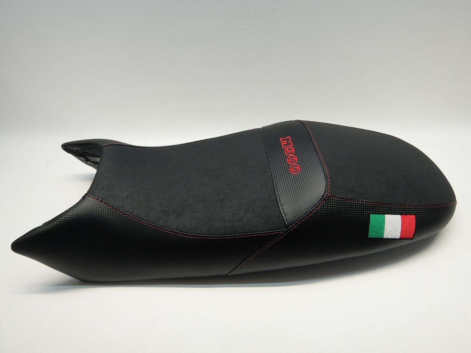Kompletter Neubezug und Neupolsterung in Nubuck/Carbon, Ziernaht Rot, Stick mehrfarbig – mit Komfortpolsterung/Gel-Aktivmatte, Fahrerbereich gerade gestellt, Soziusteil um 2cm aufgepolstert und verbreitert.