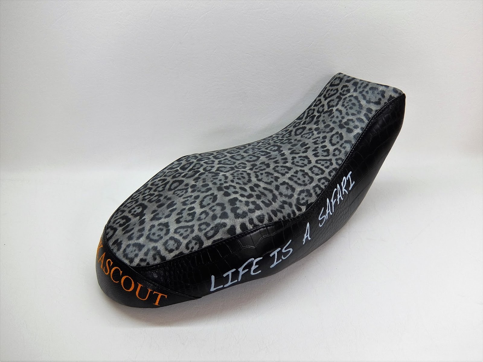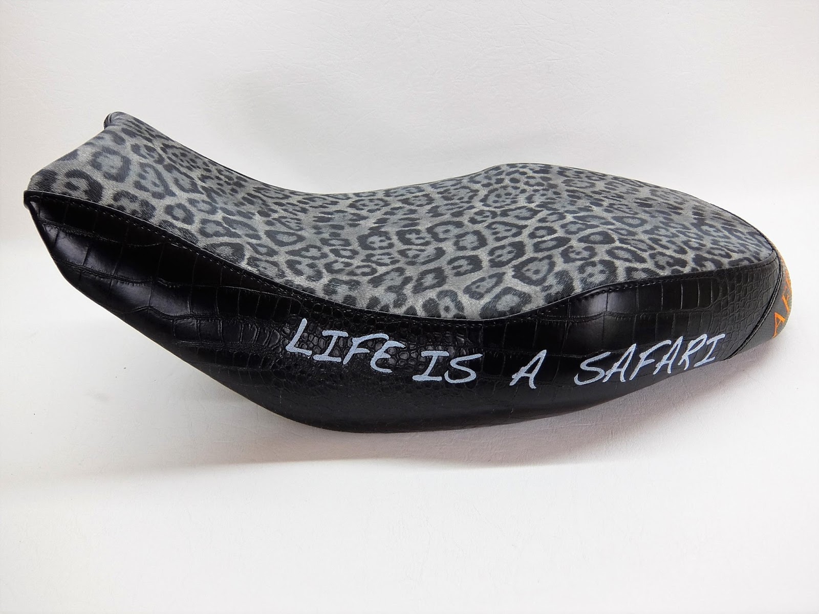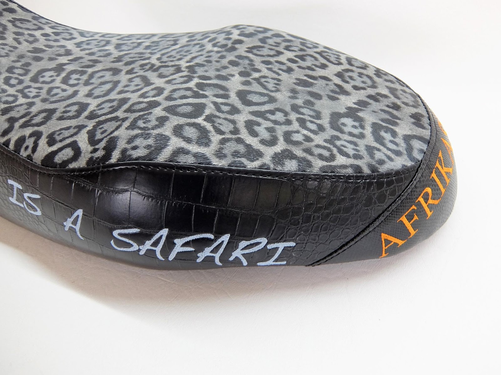 Sitzbank um 2cm im Fahrerbereich abgepolstert und mit einem Neubezug in Leopard, Krokodil und Schlange gefertigt, Stickereien