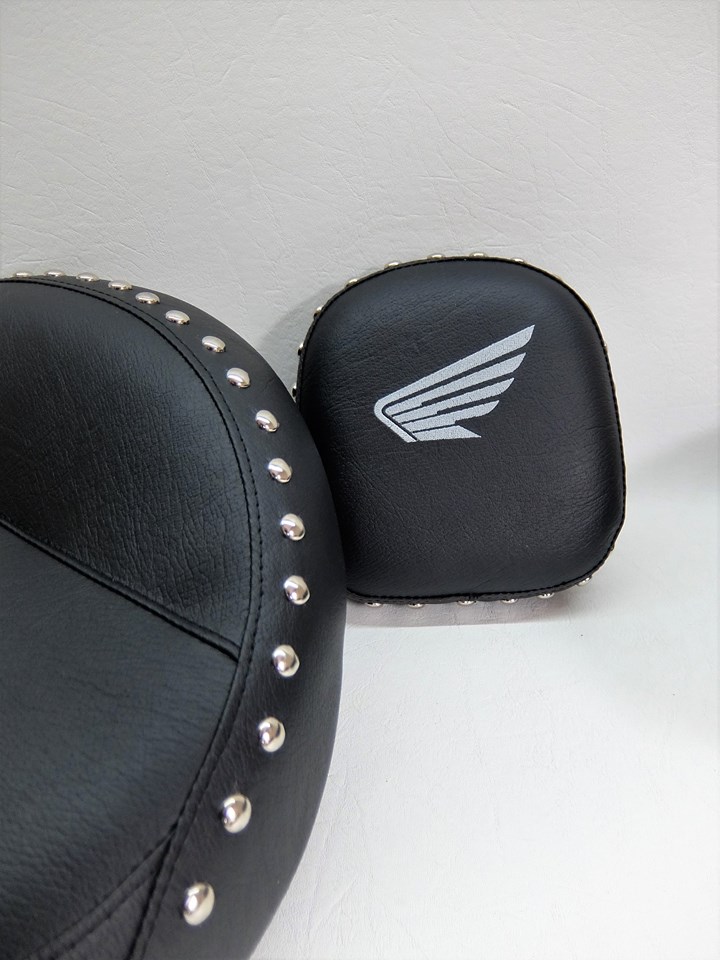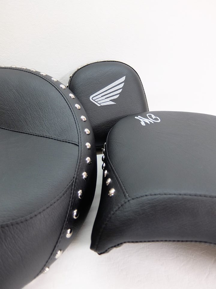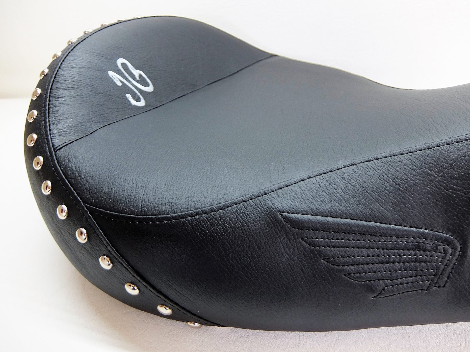 Fahrer, Soziussitz und Sissybar gemäß Kundenwunsch komplett Neubezug in Classic-Schwarz mit einer körperspezifischen Komfortpolsterung inkl. einer Gel-Aktivmatte, Sitzbogen ausgefräst. Ziernaht Schwarz, Hondaflügel in schwarz und freihändig gesteppt, Nieten Stick in Silber.