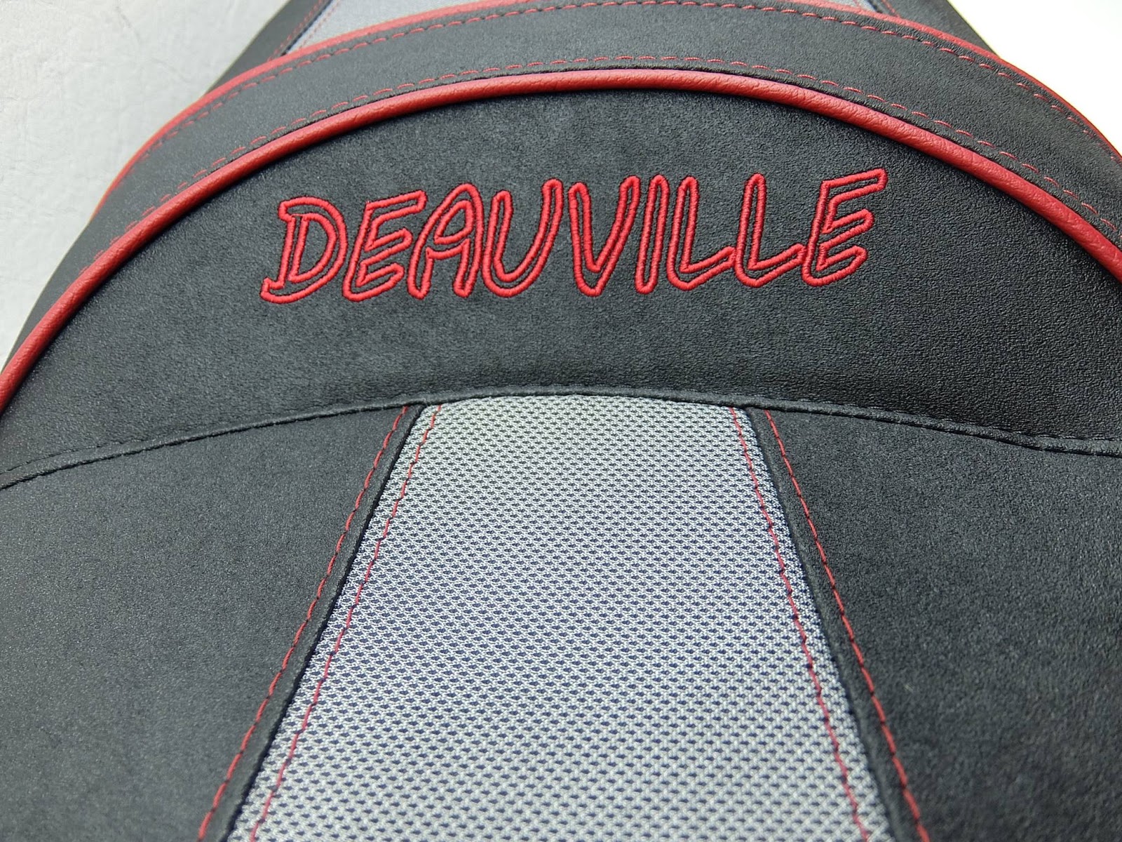Sitzbank komplett mit einem Neubezug in Antirutsch‑Silber und Nubuck gearbeitet, doppelte Ziernaht, Keder und Stickerei in Rot. An den Fahrer angepasste Komfortpolsterung/Gel‑Aktivmatte. Aufpolsterung beim Fahrersitz um 2 cm, Soziussitz um 4 cm und die Lendenstütze angeglichen.