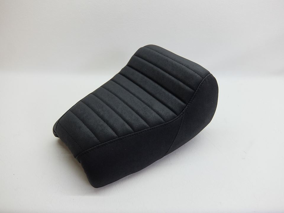 Sitzbank kompletter Neubezug in Nubuck mit Quersteppung und doppelten Ziernähten in Schwarz. Lendenstütze gekürzt und runder gepolstert, den Bezug nach hinten herumgezogen und zum Tank hin aufgepolstert + Einarbeitung einer Carbonheizmatte.