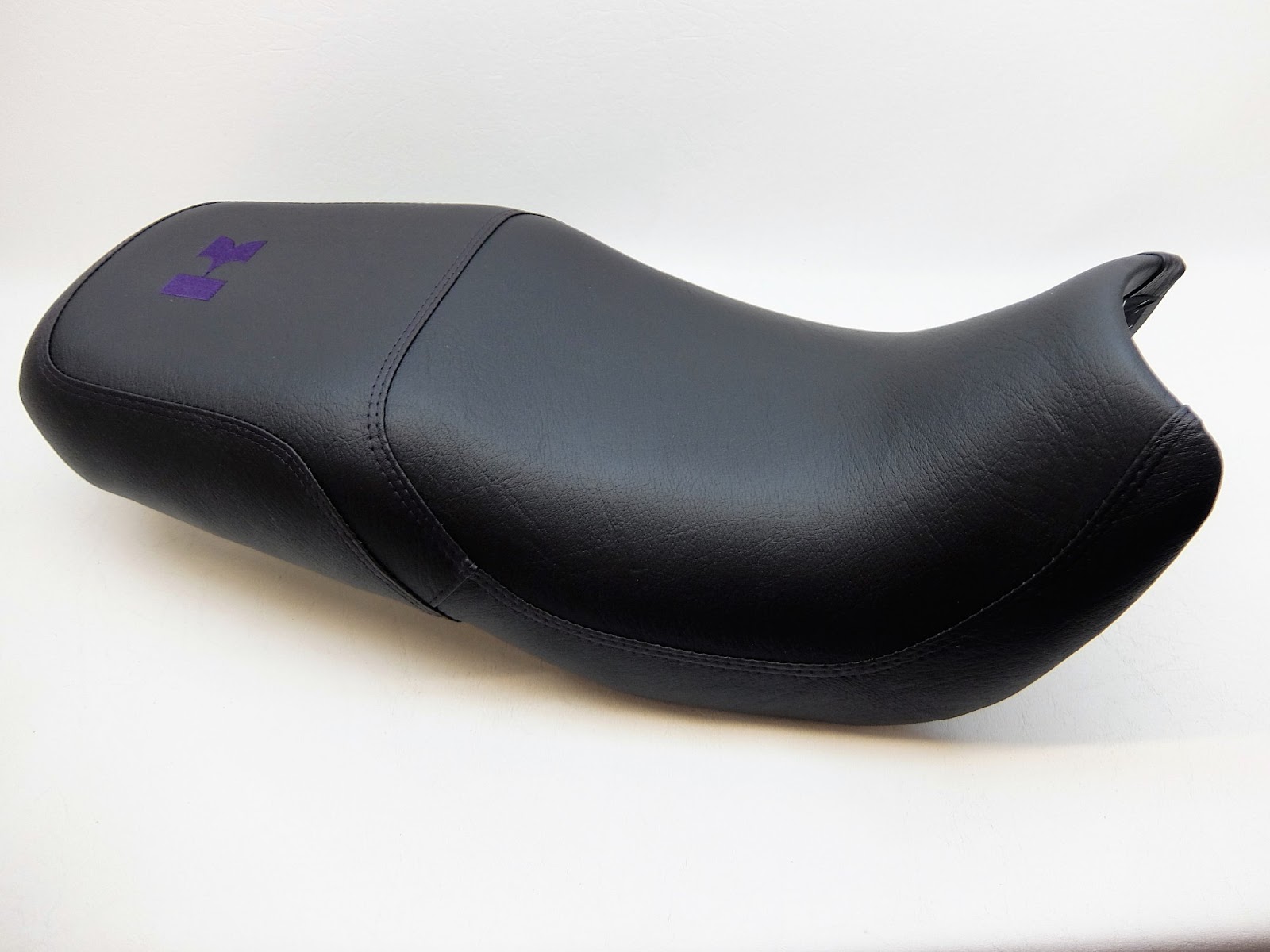 Sitzbank komplett mit einem Neubezug in Classic‑Schwarz, doppelte Ziernähte gearbeitet und mit einer Stickerei in Violett. 2,5 cm Aufpolsterung und in Form gebracht.