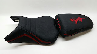 Wir haben den Fahrer und Soziussitz mit einem kompletten Neubezug in Nubuck, Matt und Rot und mit einer körperspezifischen Komfortpolsterung incl. einer Gel-Aktivmatte neugepolstert, Soziussitz als Lendenstütze 4cm