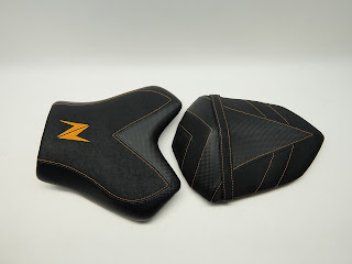 Kompletter Neubezug in Nubuck und Carbon, doppelt-wechselseitige Ziernaht in Schwarz/Orange, Stickerei in Orange – mit einer körperspezifischen Komfortpolsterung incl. Gel-Aktivmatte + Gurtanfertigung.
