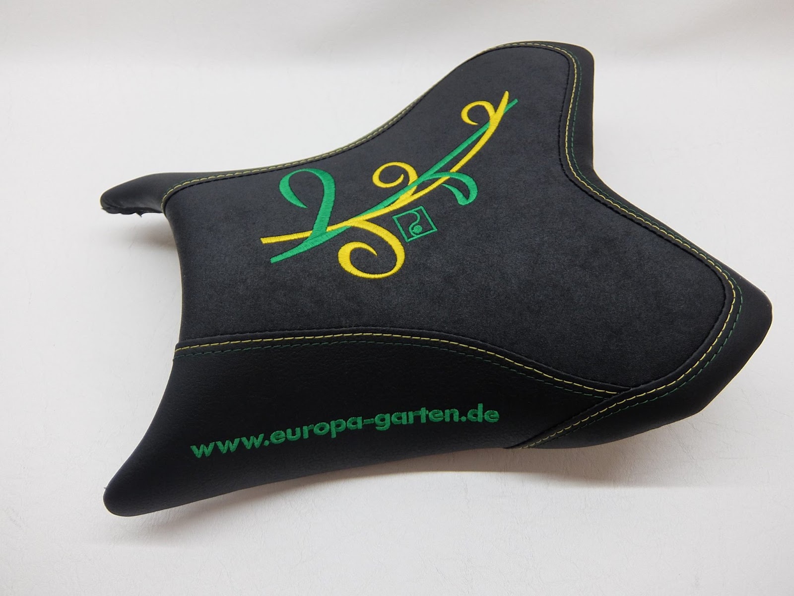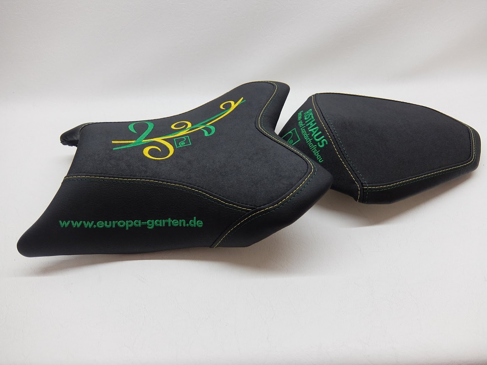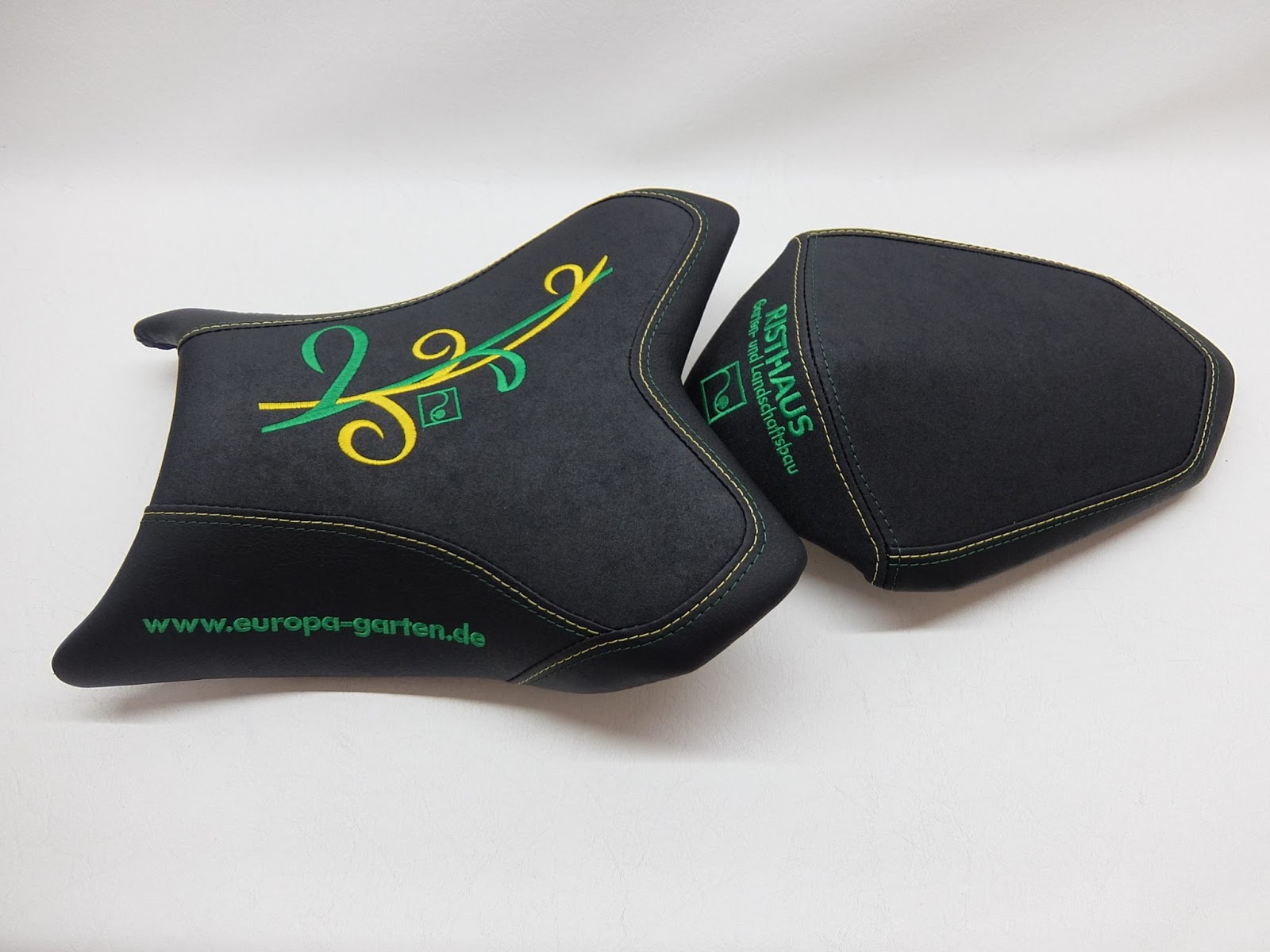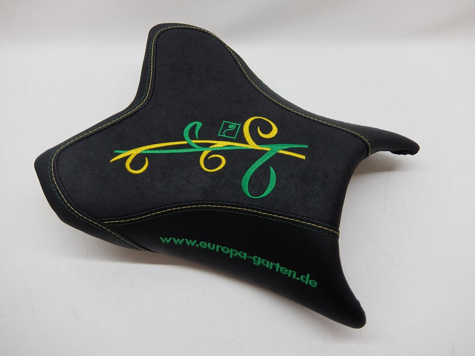 Fahrer & Soziussitz mit einem kompletten Neubezug in Nubuck und Matt gefertigt. Mit einer körperspezifischen Komfortpolsterung inkl. Gel‑Aktivmatte gearbeitet. Die doppelten wechselseitigen Ziernähte und die Stickereien in Gelb/Grün.