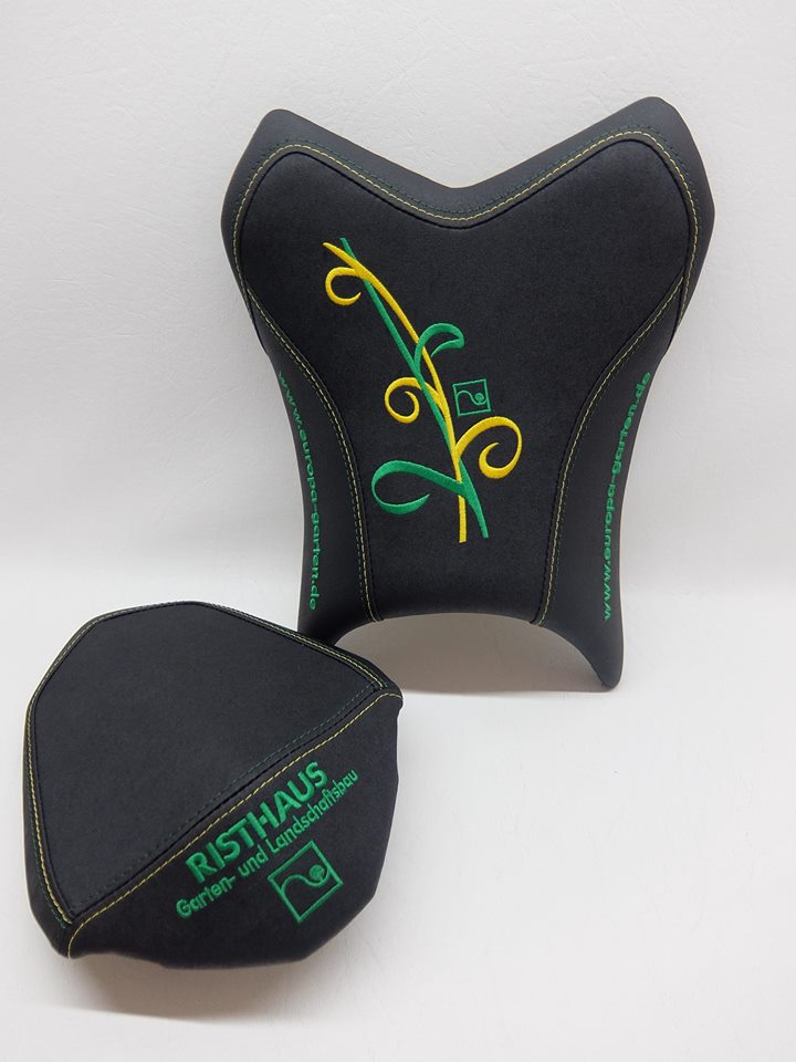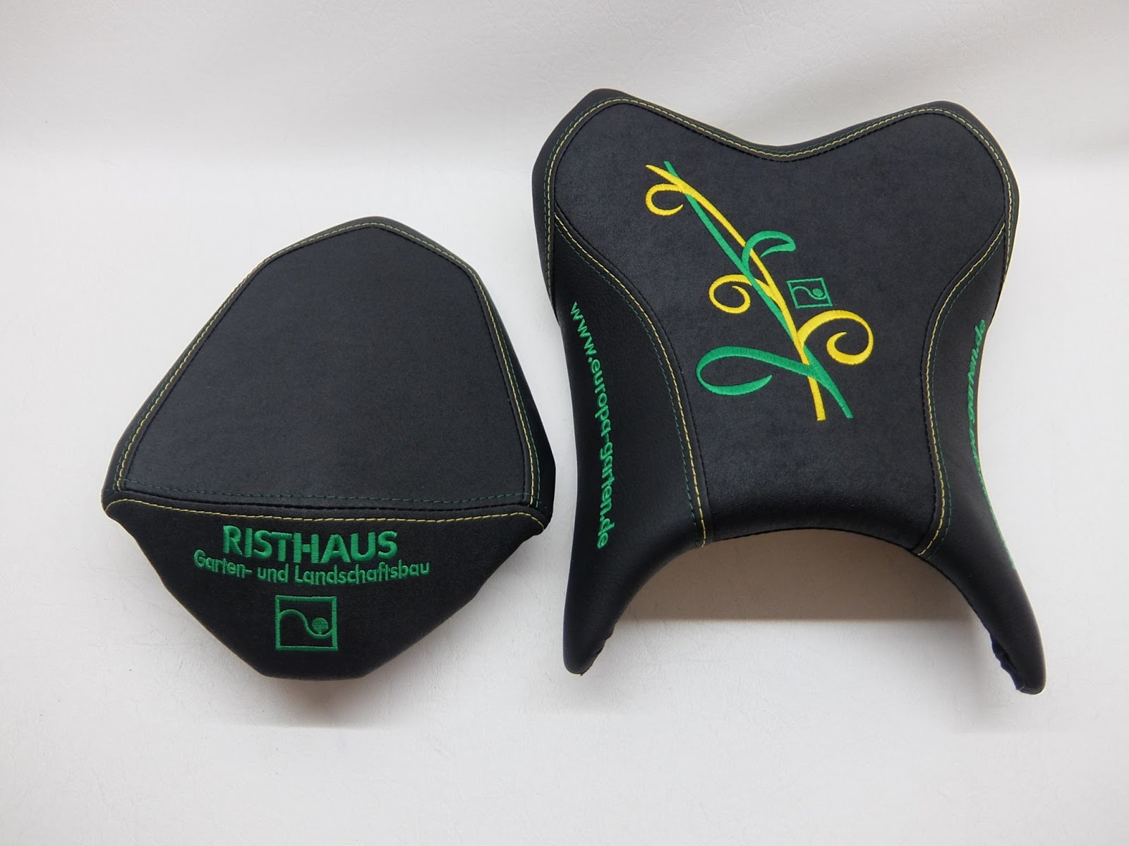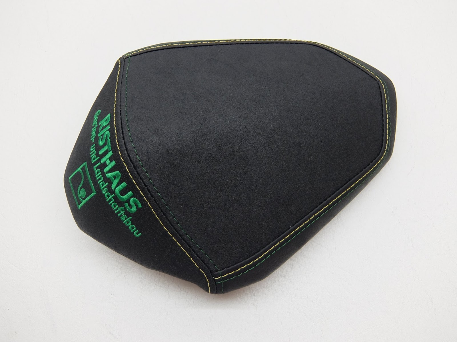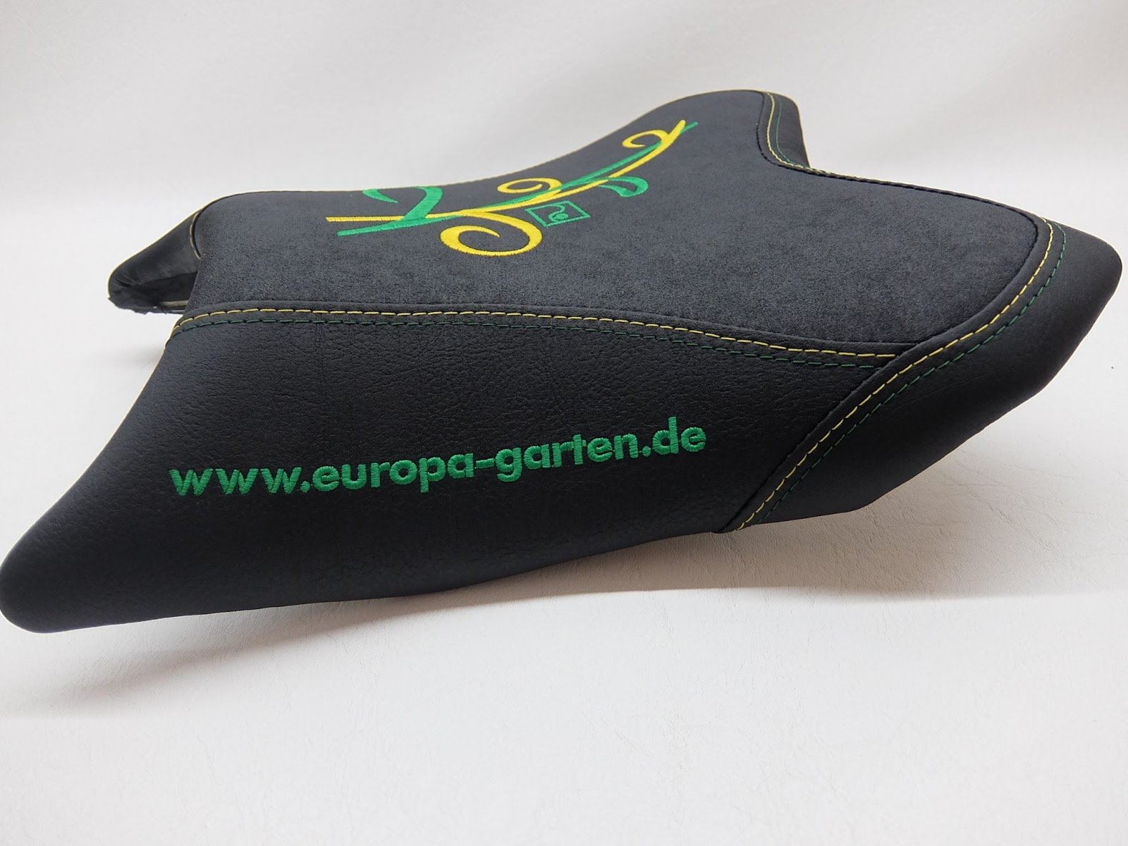 Fahrer & Soziussitz mit einem kompletten Neubezug in Nubuck und Matt gefertigt. Mit einer körperspezifischen Komfortpolsterung inkl. Gel‑Aktivmatte gearbeitet. Die doppelten wechselseitigen Ziernähte und die Stickereien in Gelb/Grün.