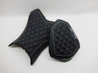 Fahrer & Soziussitz mit einem kompletten Neubezug in Nubuck und in Matt gefertigt. Mit einer körperspezifischen Komfortpolsterung incl. einer Gel-Aktivmatte gearbeitet. Die doppelten wechselseitigen Ziernähte und die Stickereien in Gelb/Grün.
