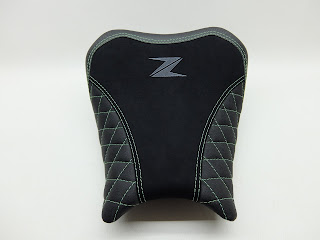 Kompletter Neubezug in Alcantara-S, Nubuck und Carbon, seitliche Rautensteppung mit Ziernähten in Grün, Stickerei in Anthrazit – mit einer körperspezifischen Komfortpolsterung/Gel-Aktivmatte.
