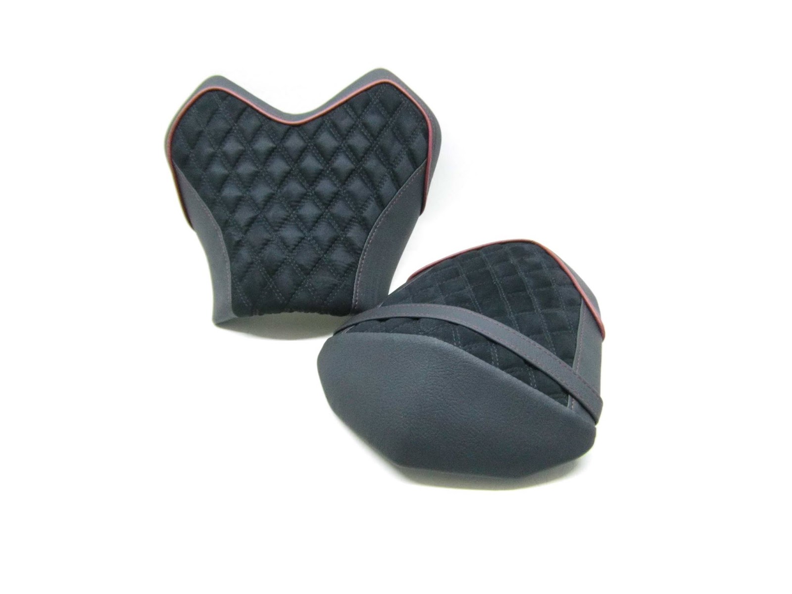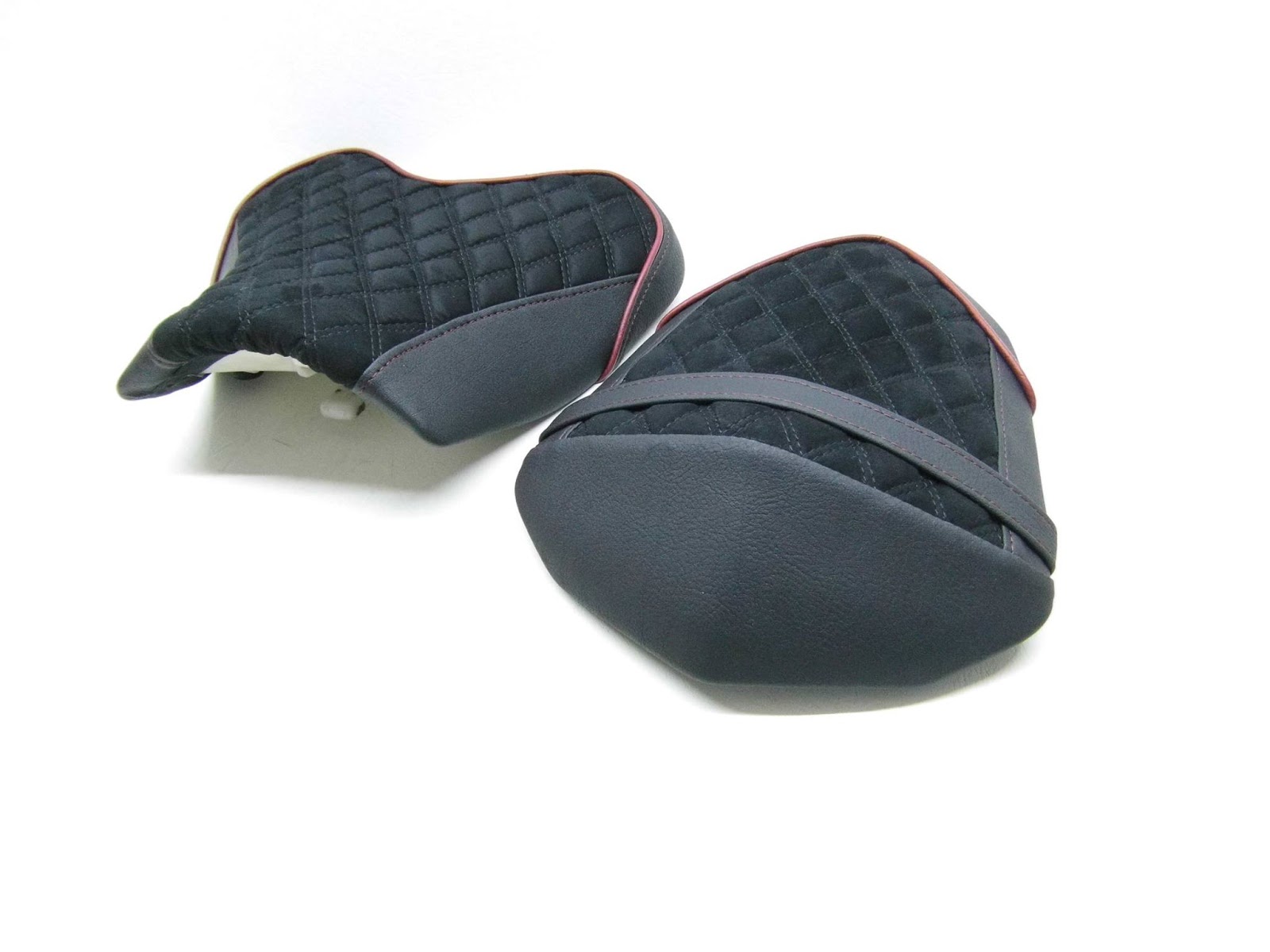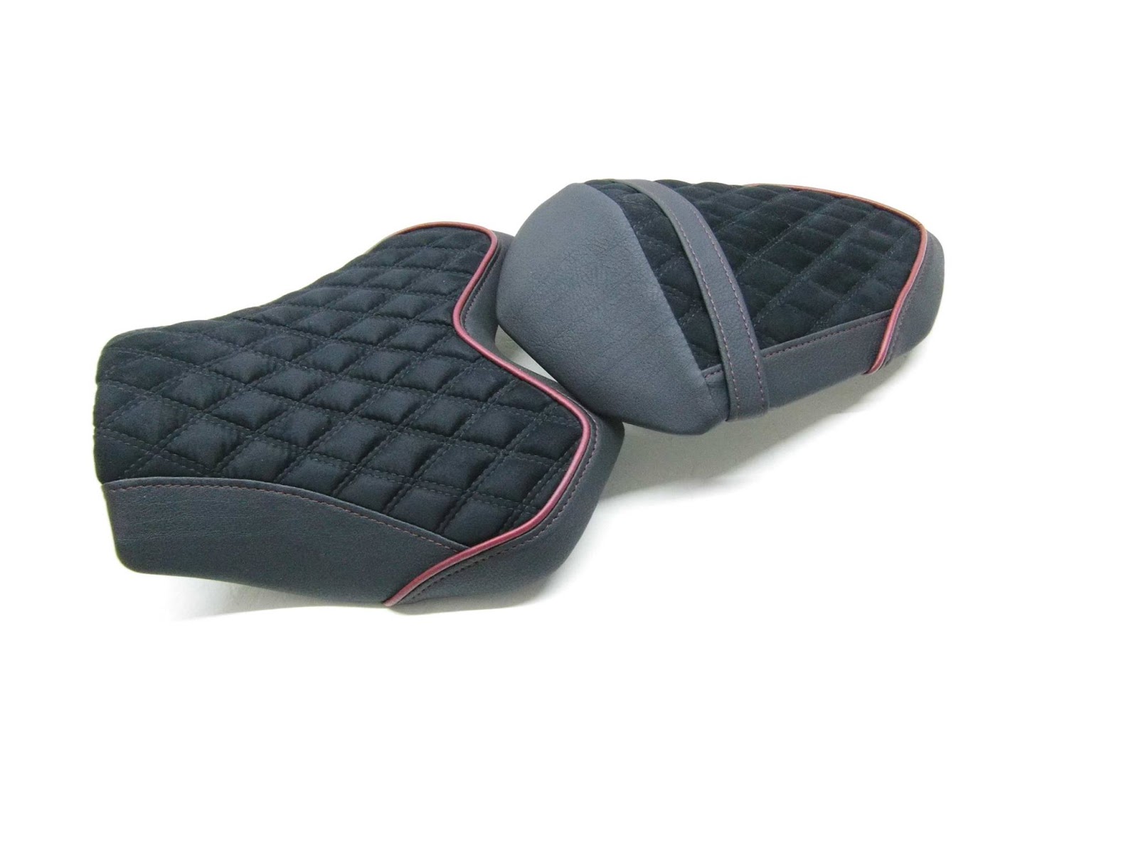 Fahrer & Soziussitz kompletter Neubezug und Neupolsterung in Alcantara-S und Matt mit einer körperspezifischen Komfortpolsterung incl. Gel-Aktivmatte. Rautensteppung mit doppelter Ziernaht in Schwarz, Ziernaht und Keder in Bordeaux