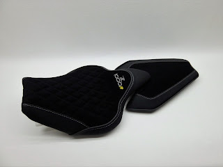 Neuer Bezug in Alcantara-S und Matt, Rautensteppung mit doppelter Ziernaht in Schwarz, Ziernaht/Keder in dunkel Grau, Stickerei in Dunkel-Grau/Gelb – mit Komfortpolsterung incl. Gel-Aktivmatte.