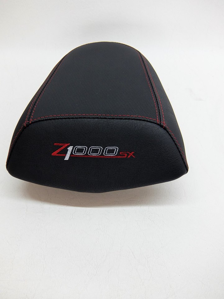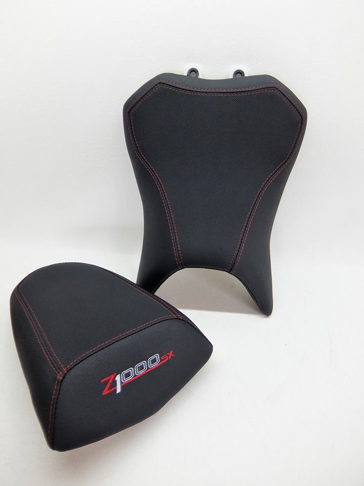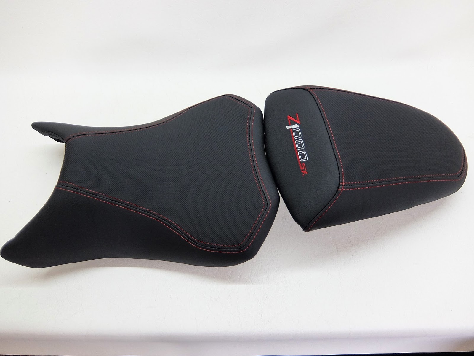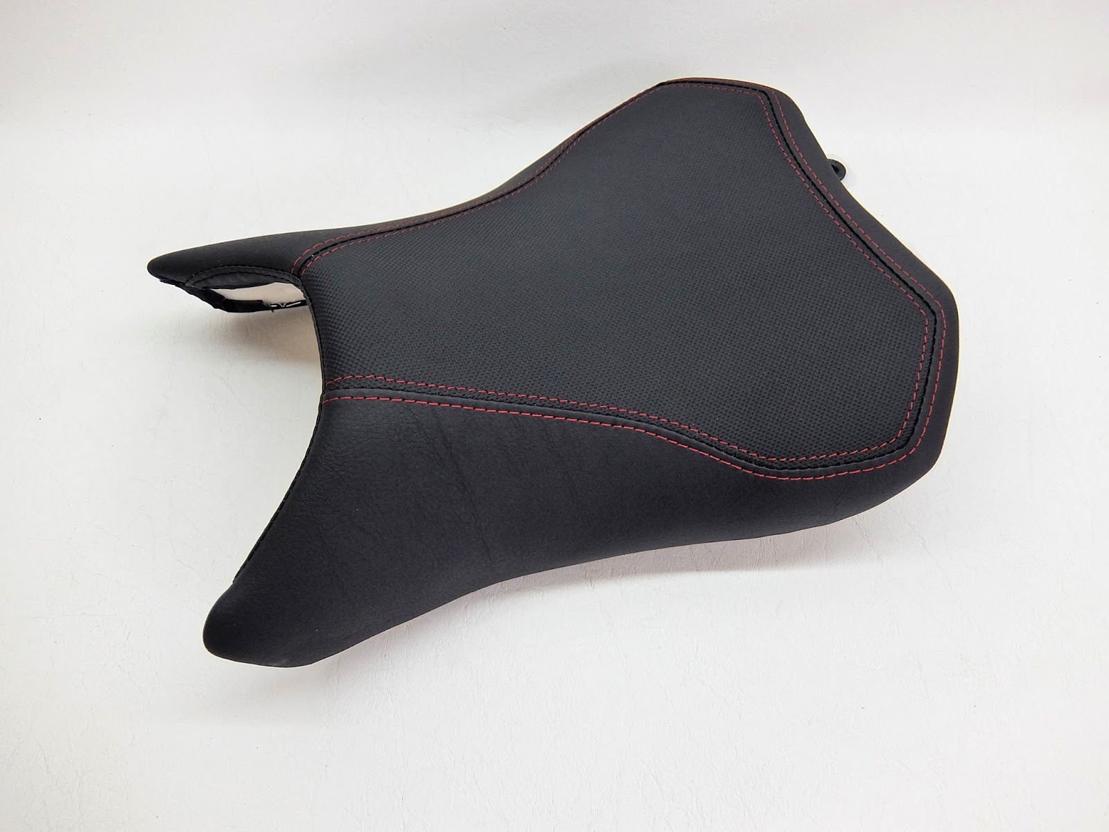Fahrer und Soziussitz, kompletter Neubezug in Antirutsch und Matt mit einer körperspezifischen Komfortpolsterung inkl. Gel‑Aktivpad. Doppelte Ziernaht Rot, Stickerei in Rot/Weiß.