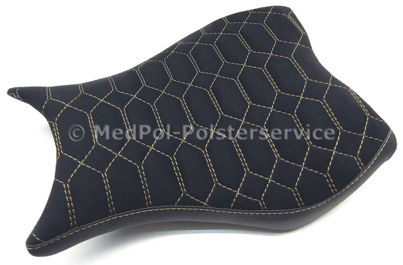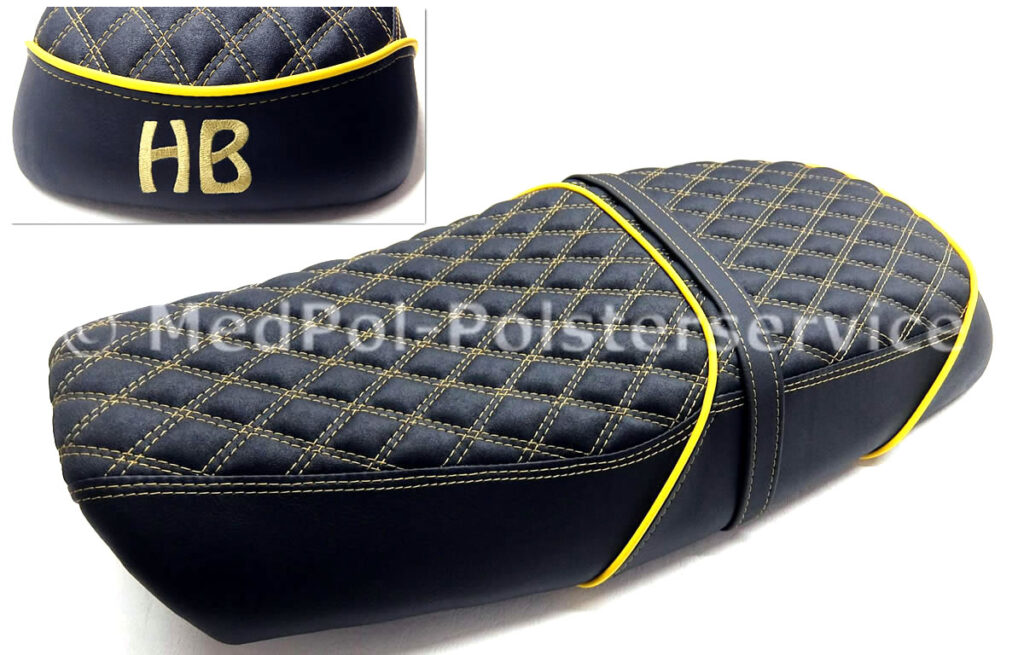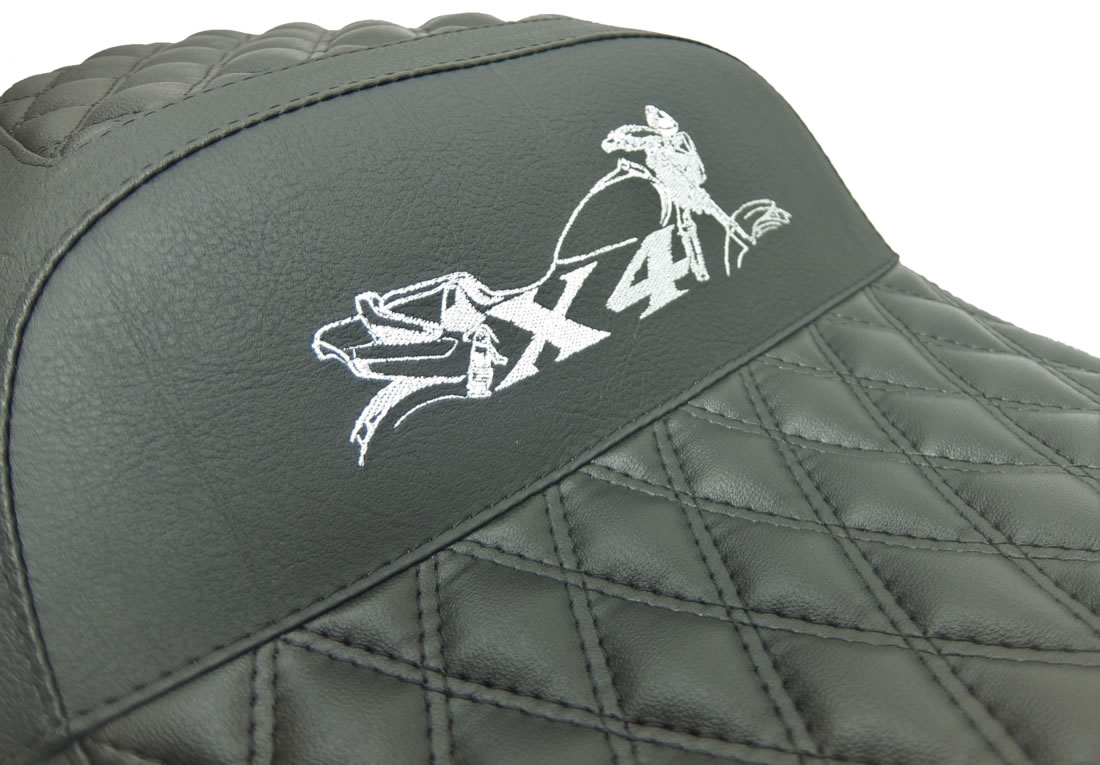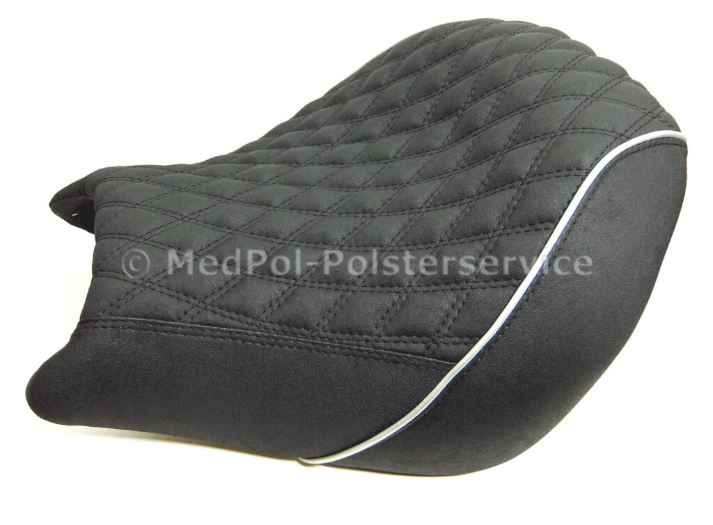 Sitzbank komplett Neubezug in Slim/Matt mit Rautensteppung doppelter Ziernaht Schwarz, Stickerei