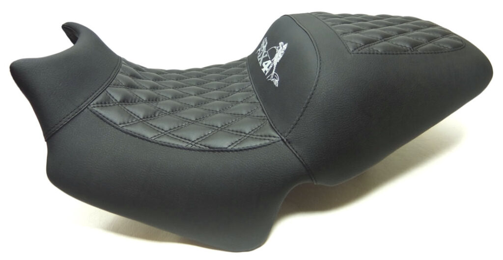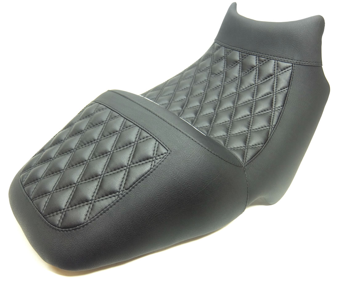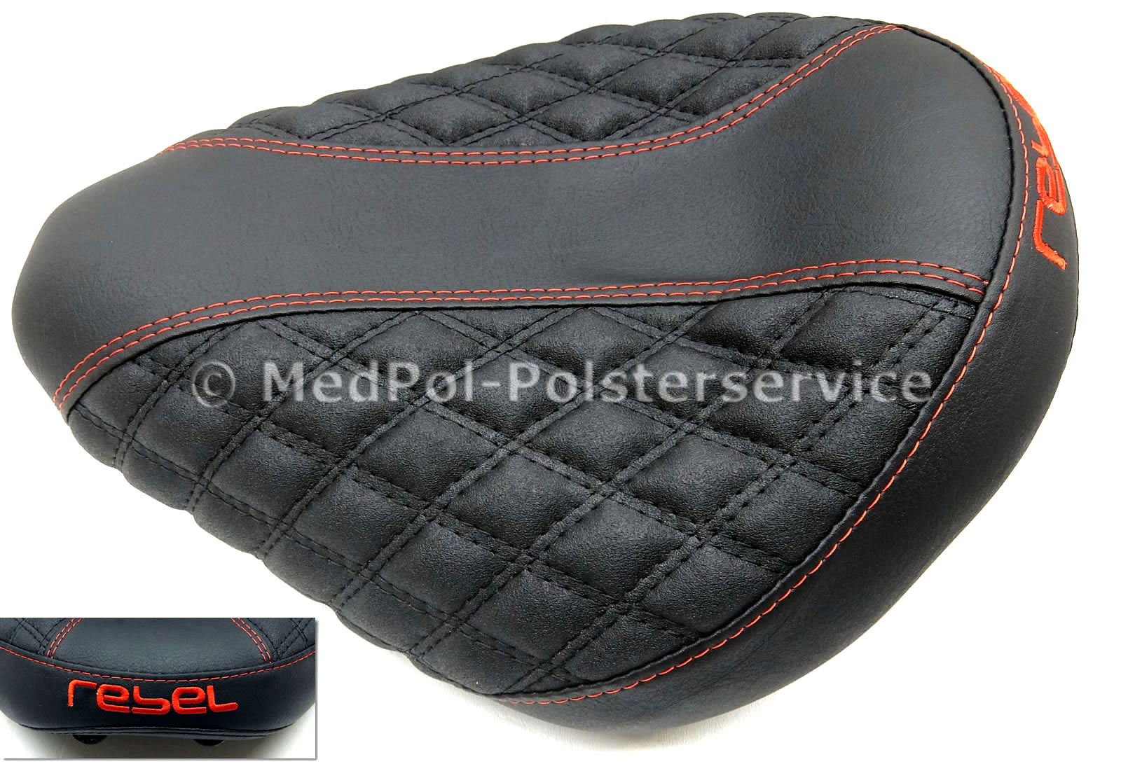 Sitzbank komplett Neubezug in Slim/Matt mit Rautensteppung doppelter Ziernaht Schwarz, Stickerei
