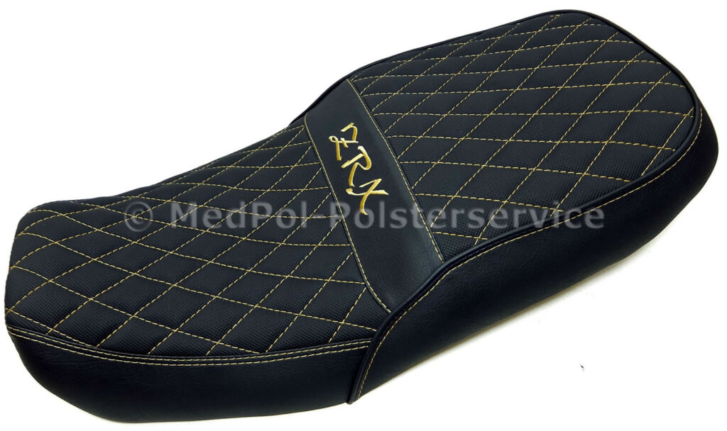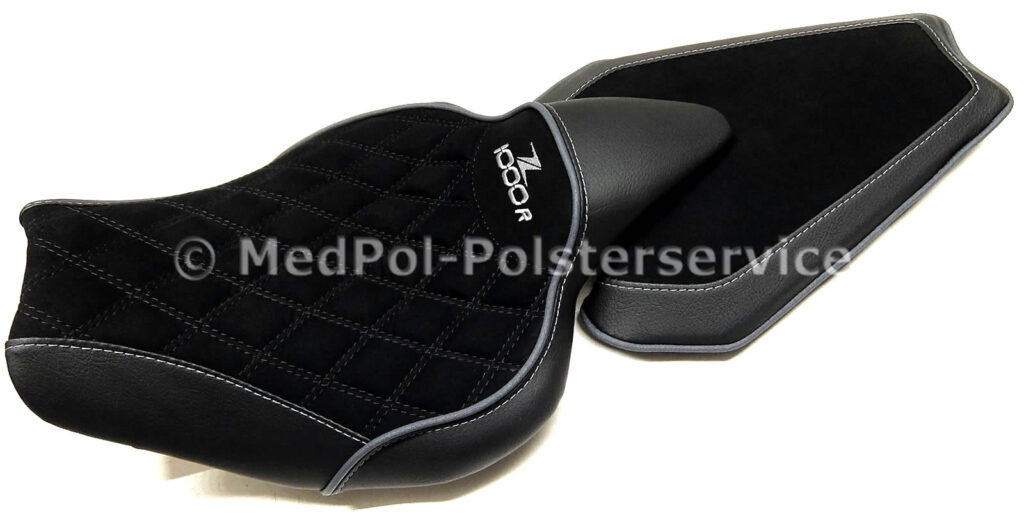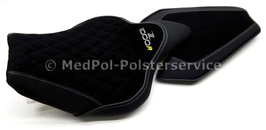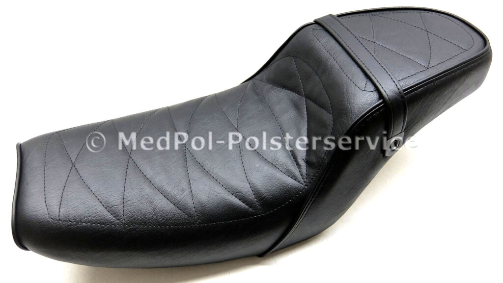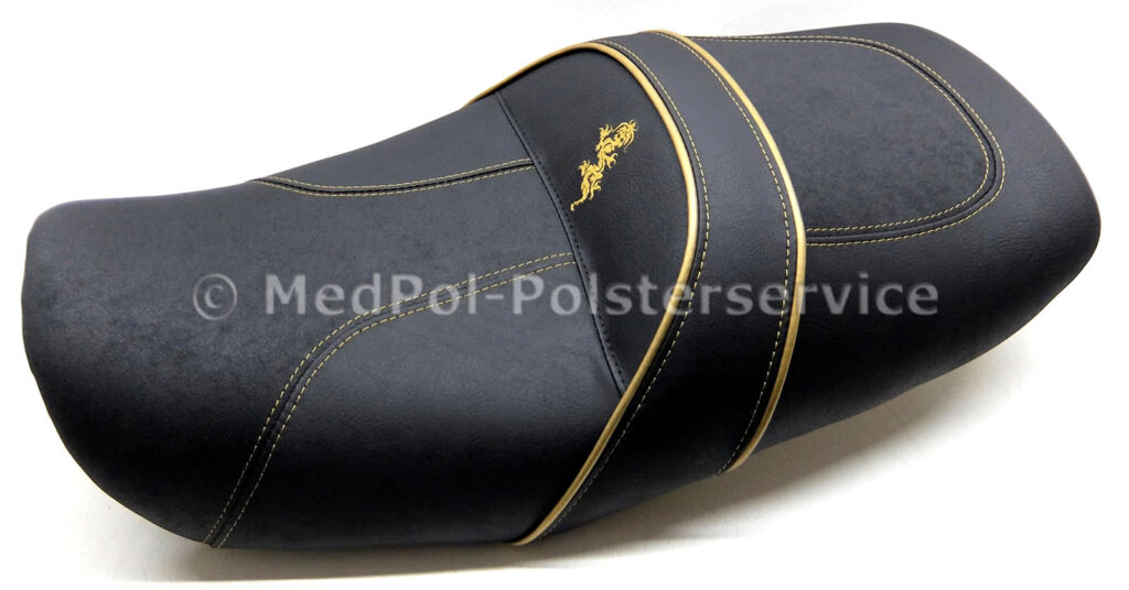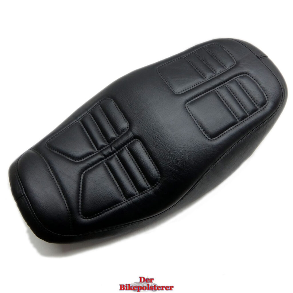 Unsere neugepolsterten Kawasaki „Zephyr“ Sitzbänke bieten höchsten Komfort und Stil für dein Motorrad. Jede Sitzbank wird individuell auf die Körpermaße des Fahrers angepasst, um maximalen Komfort zu gewährleisten. Das Design umfasst vielfältige geometrische Ziersteppungen und farblich wählbare Ziernähte, die dem Sitz eine elegante Optik verleihen. Die Bezüge sind in verschiedenen hochwertigen Materialien und Farben erhältlich.