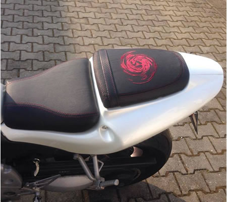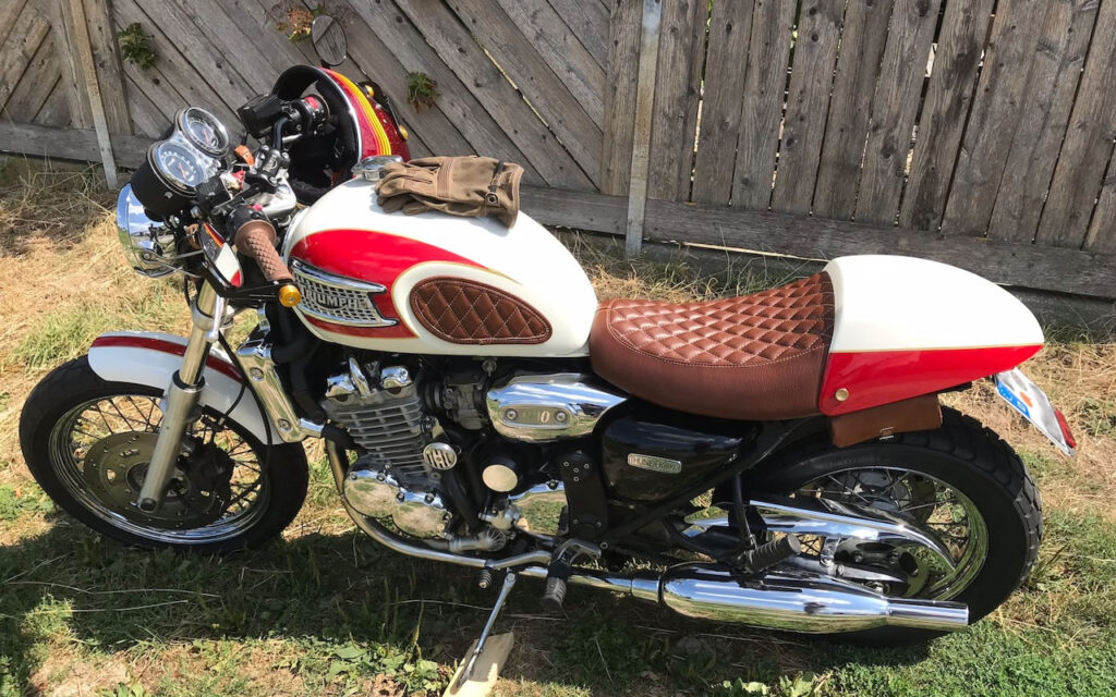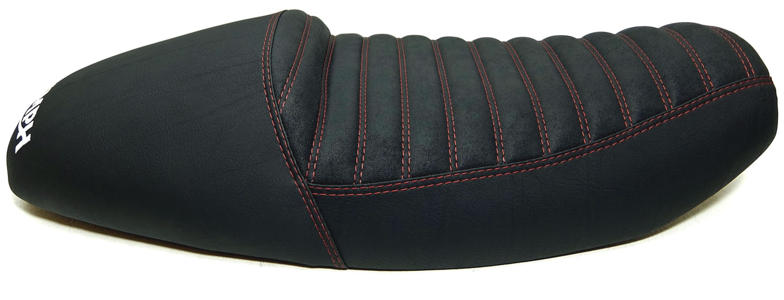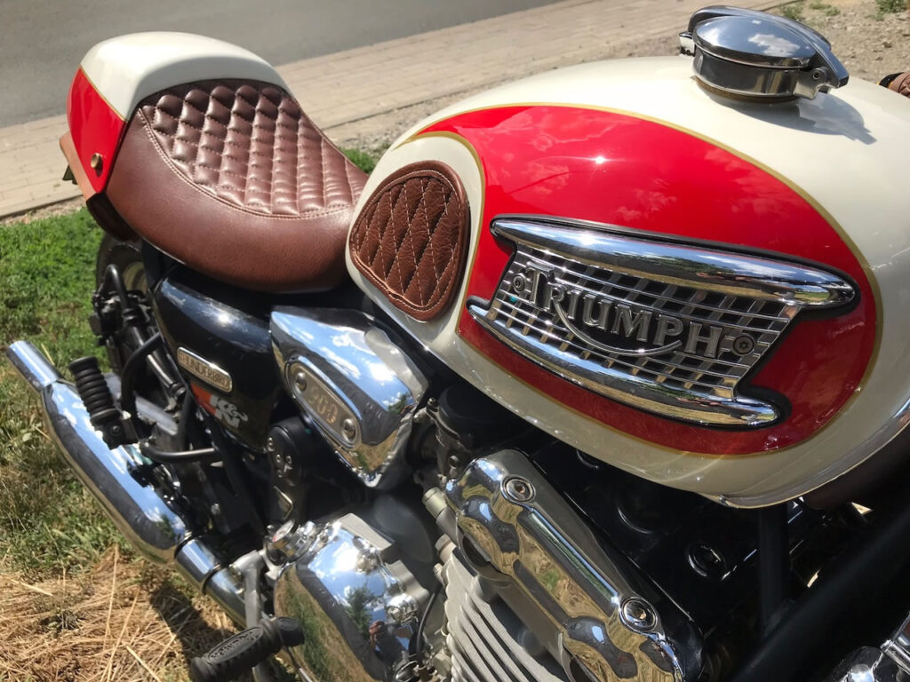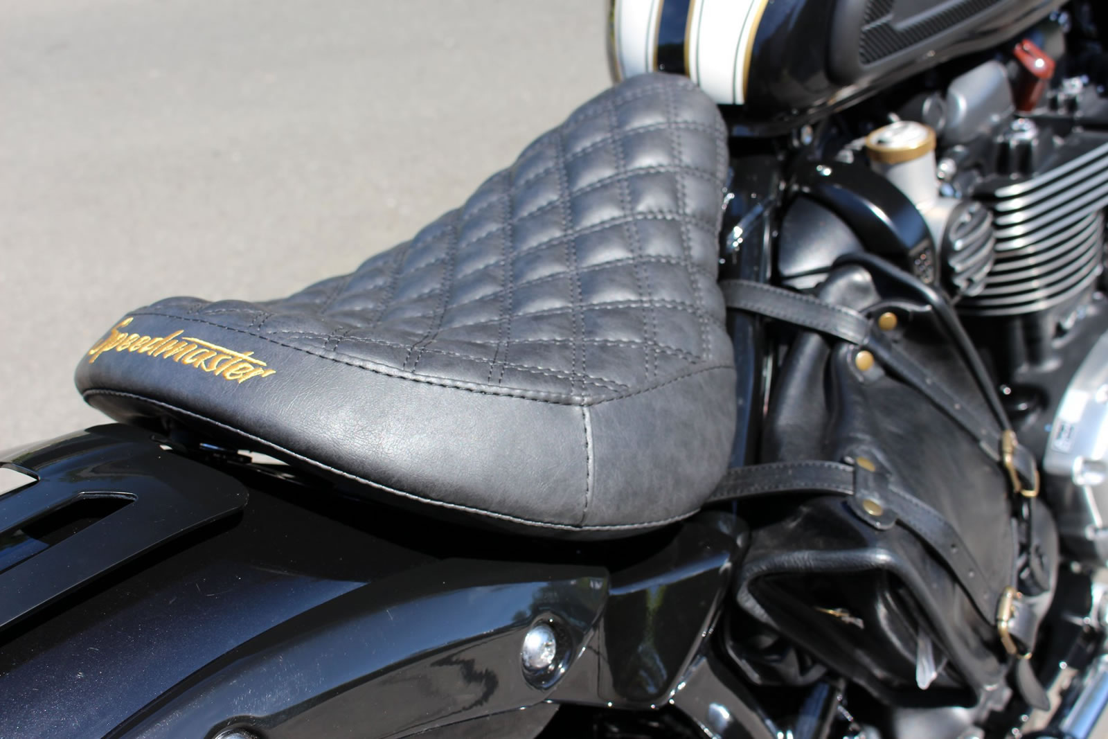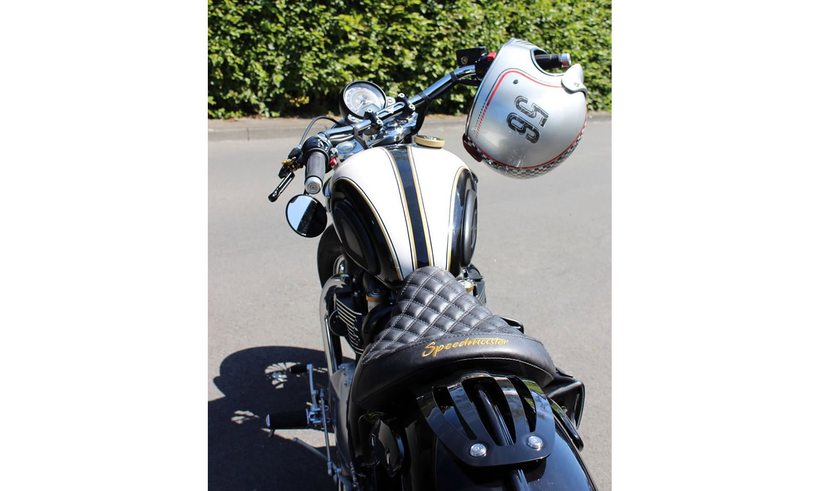 Die Triumph Speed Twin wurde zu einem Einsitzer umgebaut, mit einem Höckeraufbau und einer Komfort/Aktivmatte im Fahrerbereich, zusätzlich um 2,5 cm erhöht. Der Fahrersitz wurde mit Nubuk neu bezogen, der Rest in Matt gehalten, mit einer Quersteppung und doppelter Ziernaht in Rot sowie einer Stickerei in Weiß versehen. 🔎