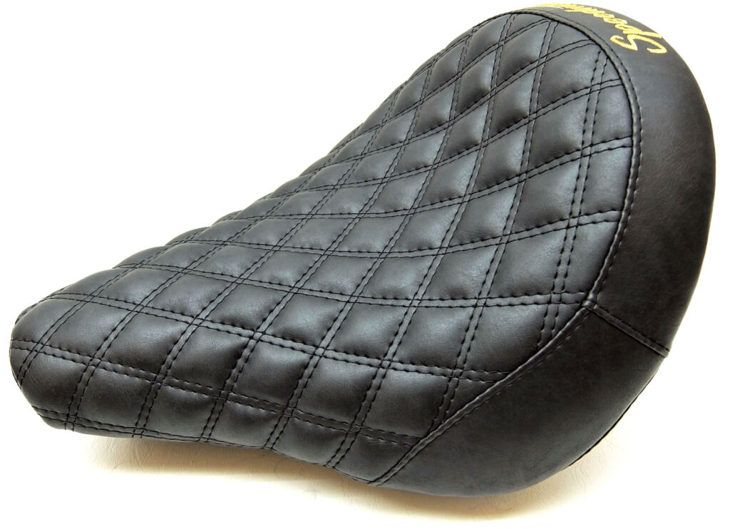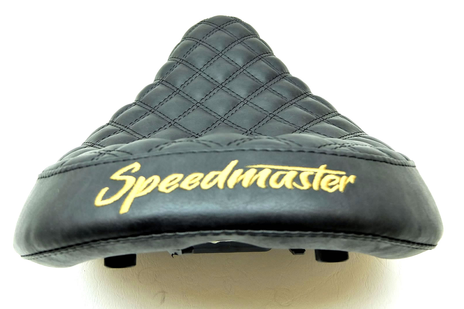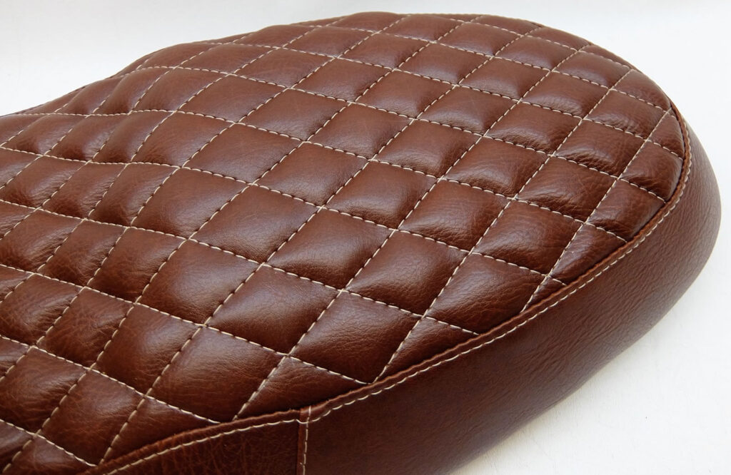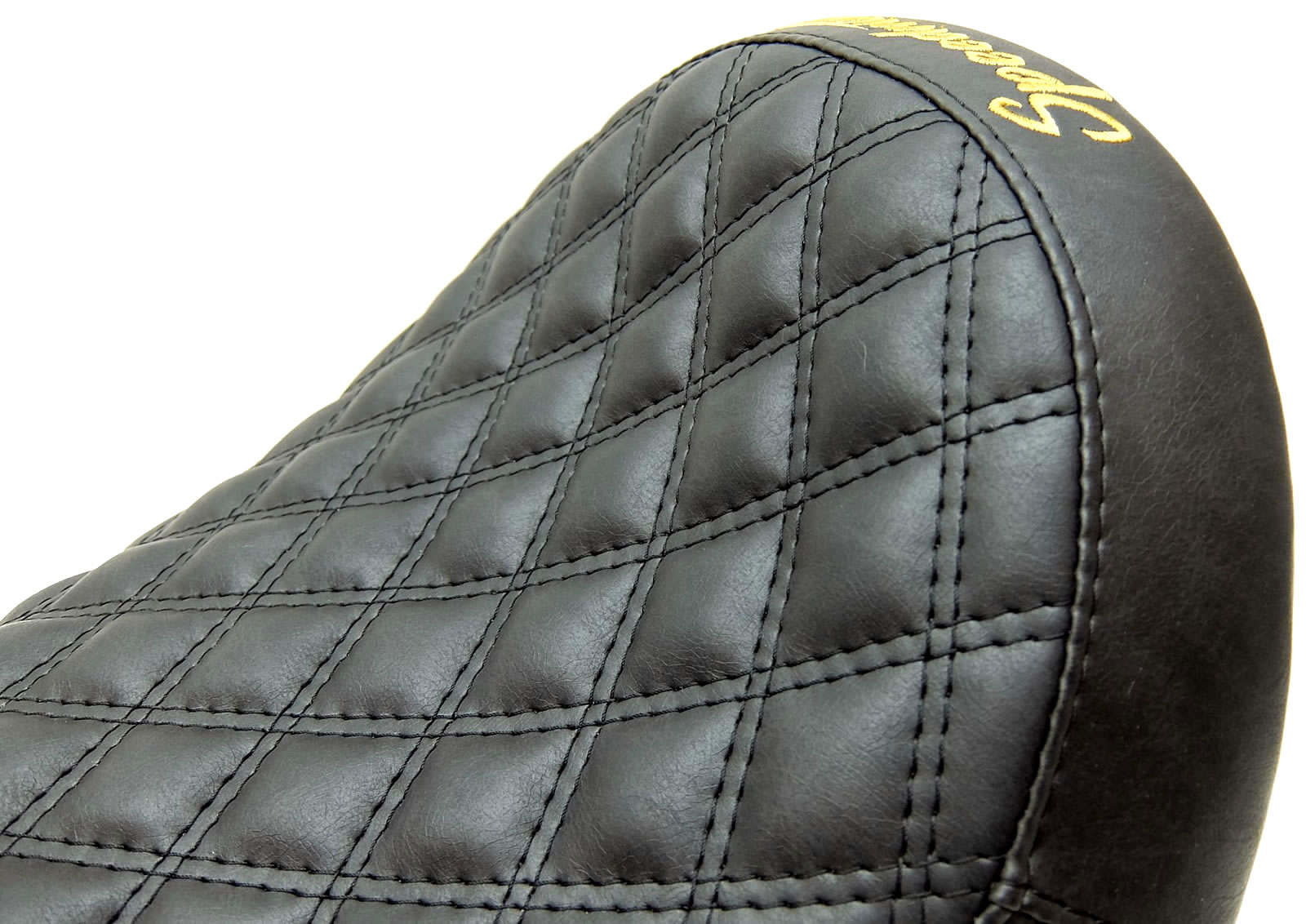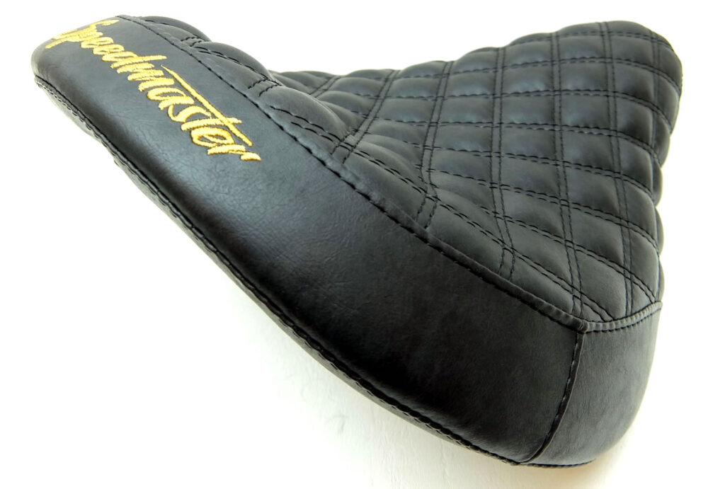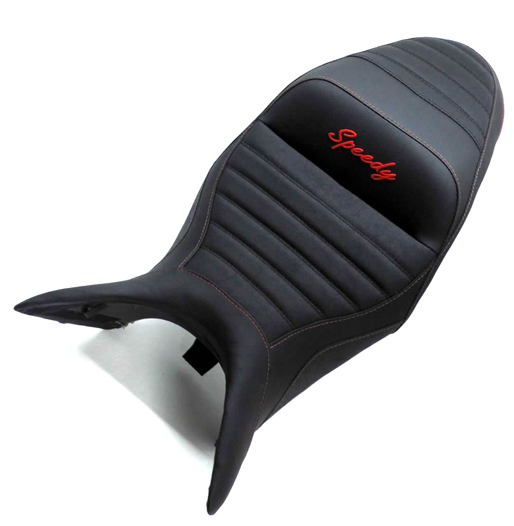 Die Triumph Speed Twin wurde zu einem Einsitzer umgebaut, mit einem Höckeraufbau und einer Komfort/Aktivmatte im Fahrerbereich, zusätzlich um 2,5 cm erhöht. Der Fahrersitz wurde mit Nubuk neu bezogen, der Rest in Matt gehalten, mit einer Quersteppung und doppelter Ziernaht in Rot sowie einer Stickerei in Weiß versehen. 🔎