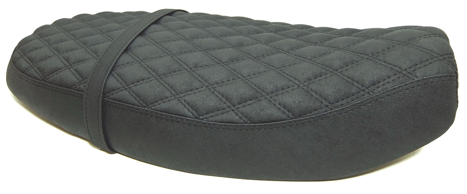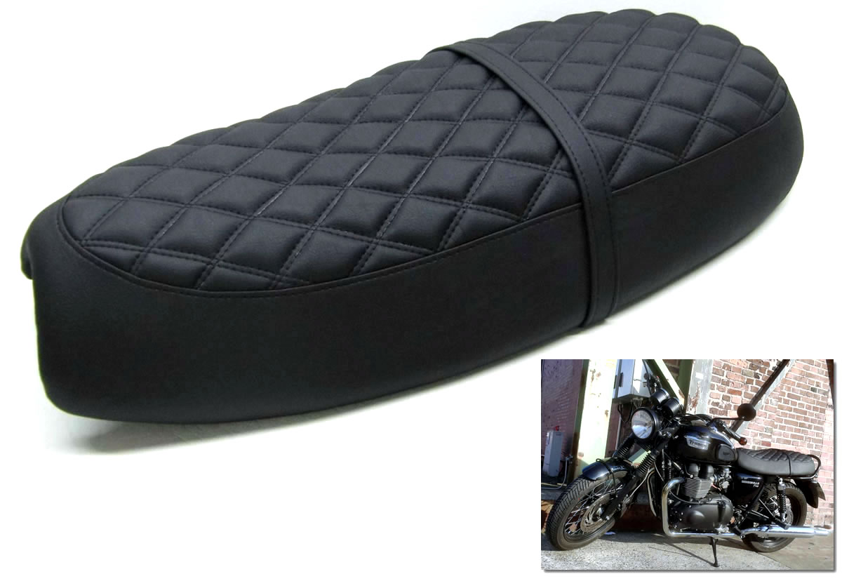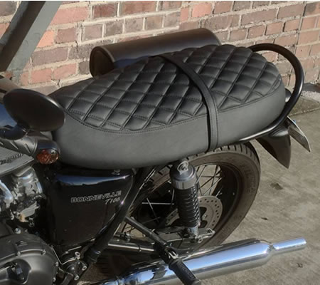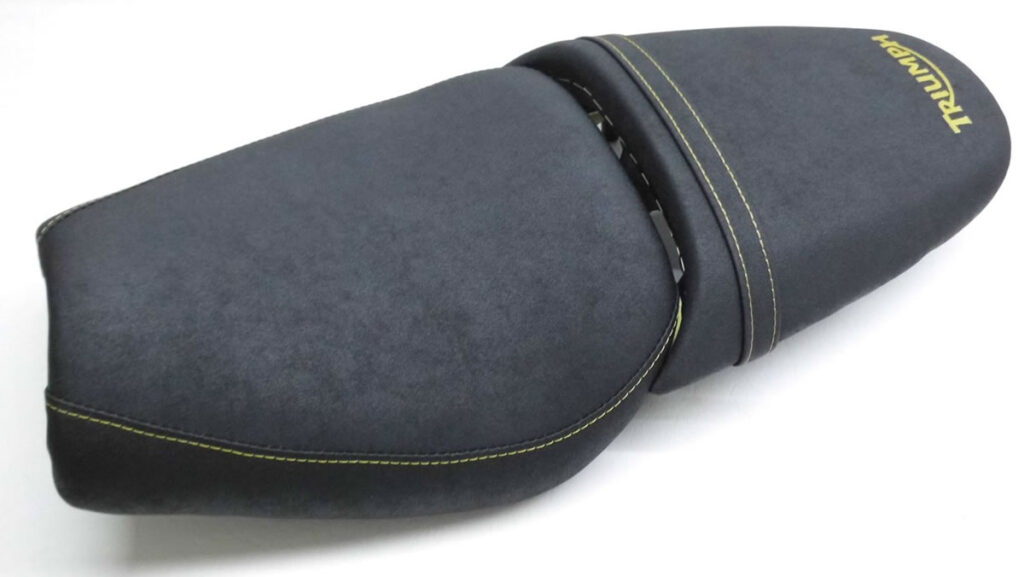 Diese Triumph Speed Twin verfügt über eine neu bezogene Sitzbank aus Nubuck-Leder mit doppelter schwarzer Rautensteppung. Die körperspezifische Komfortpolsterung inklusive Aktivmatte sorgt für maximalen Komfort. Zusätzlich wurde die Sitzhöhe um 2,5 cm erhöht und eine individuelle Gurtanfertigung integriert. 🔎