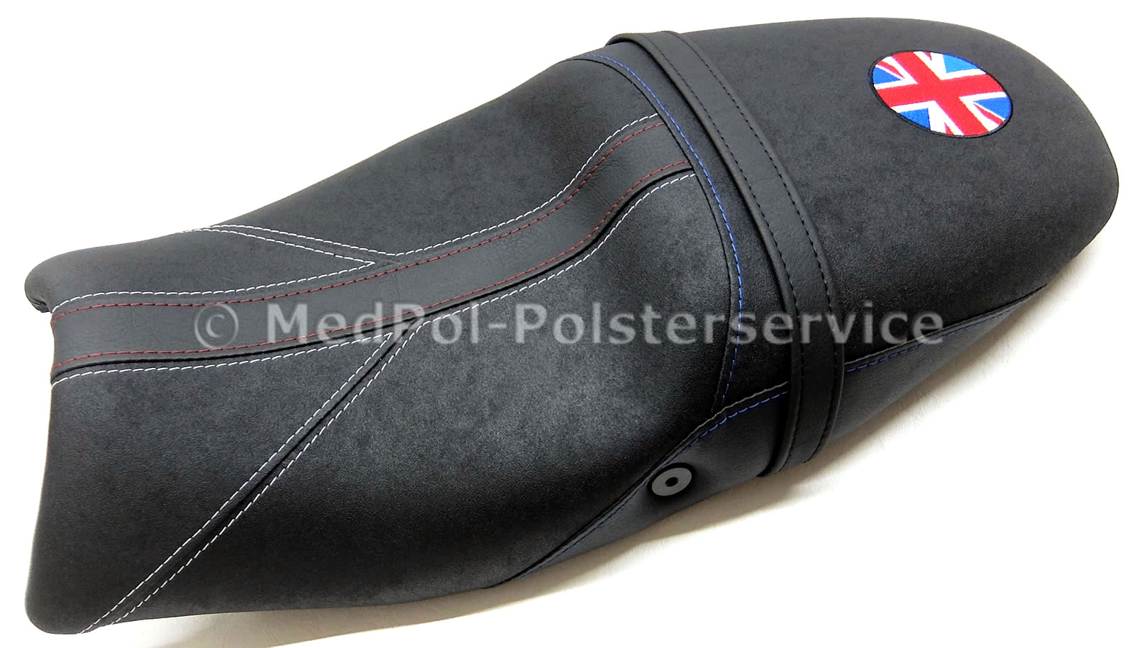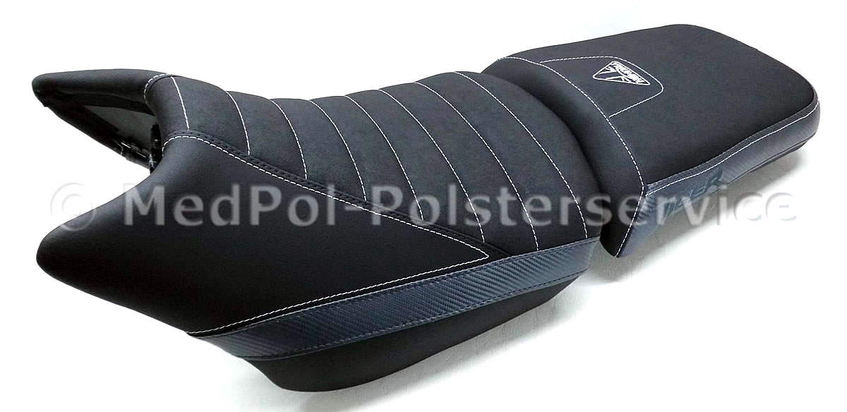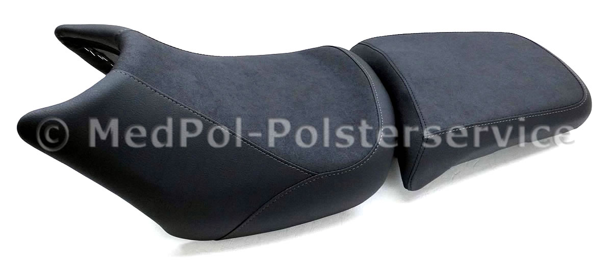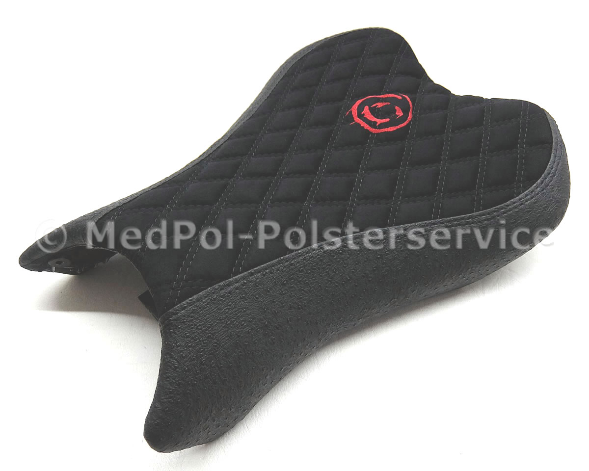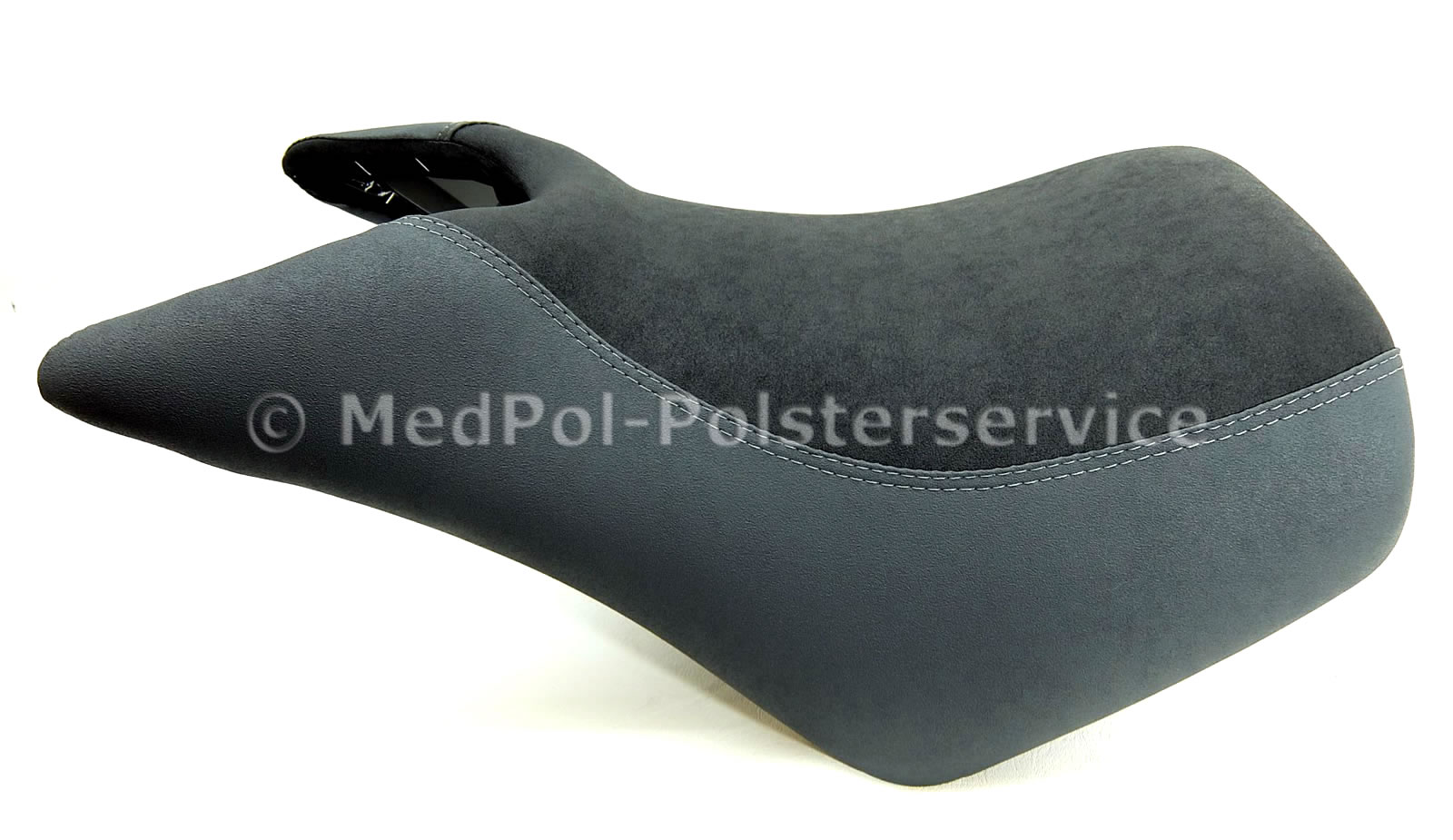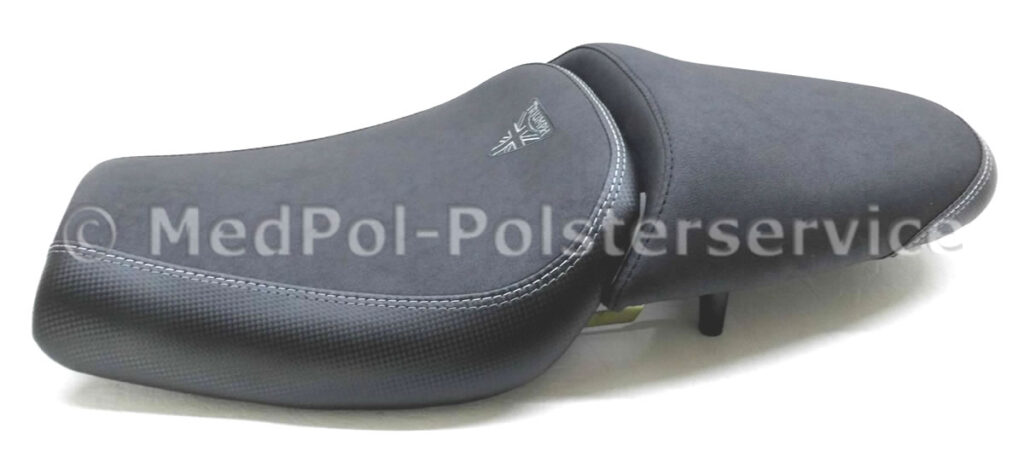 Motorradsitzbank komplett neu bezogen in Nubuk Schwarz und in Dunkelgrau, mit Rautensteppung und doppelter Ziernaht im Fahrerbereich in Silbergrau, sowie Ziernaht und Stickerei in Silbergrau – ausgestattet mit Komfortpolsterung und Gel-Aktivmatte, um 2 cm erhöht, mit einem leicht abfallenden Höckereinsatz. 🔎