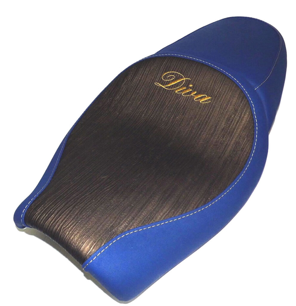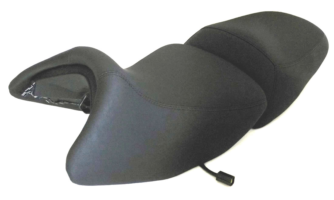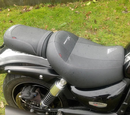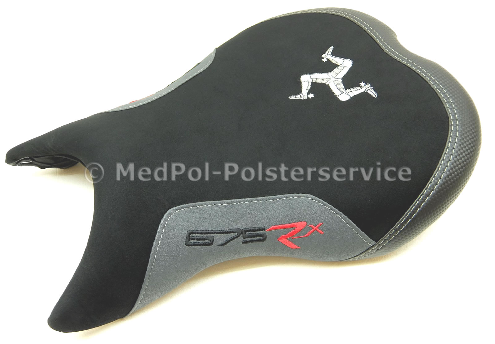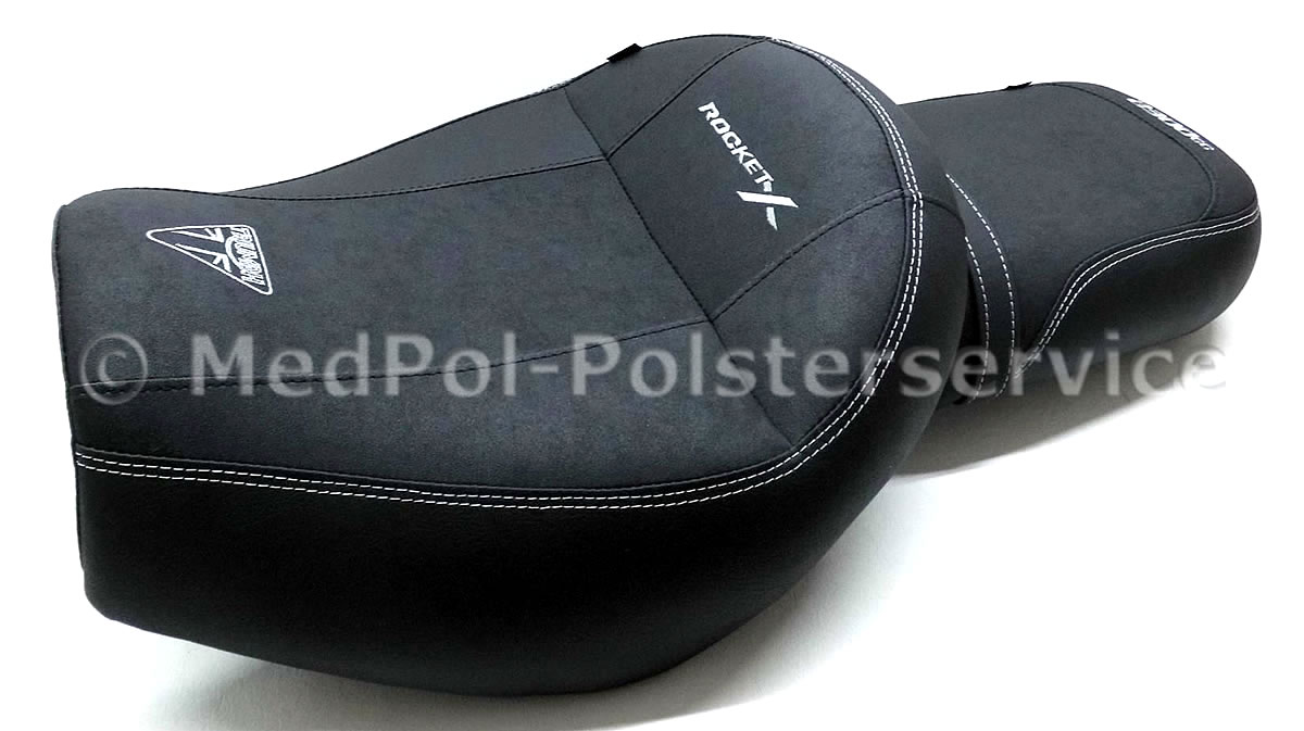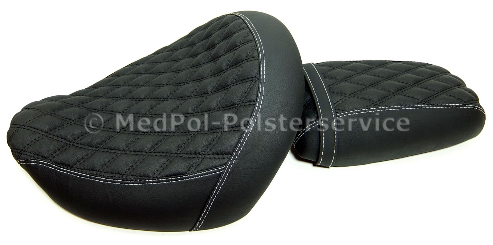 Motorradsitzbank komplett neu bezogen in Nubuk Schwarz und in Dunkelgrau, mit Rautensteppung und doppelter Ziernaht im Fahrerbereich in Silbergrau, sowie Ziernaht und Stickerei in Silbergrau – ausgestattet mit Komfortpolsterung und Gel-Aktivmatte, um 2 cm erhöht, mit einem leicht abfallenden Höckereinsatz. 🔎