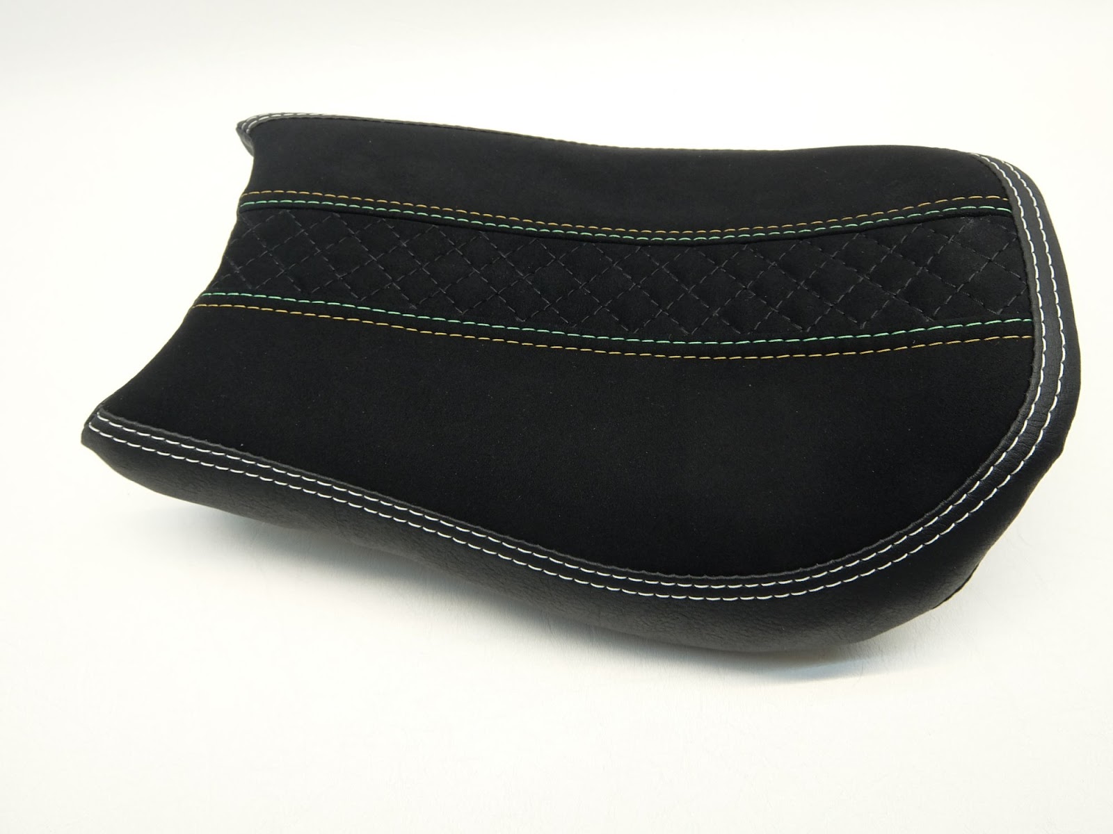 Alcantara-S + Matt mit mittiger Rautensteppuung, schwarze Ziernähte und doppelte Ziernähte in Weiß, Grün und Gold.