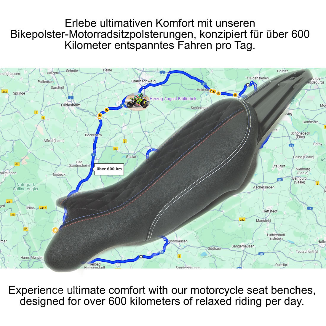 Die Sitzbank wird auf Basis der eingesendeten Originalbank komplett neu aufgebaut und ergonomisch angepasst. Polsterhöhe, Festigkeit und Form können auf die eigenen Körpermaße abgestimmt werden – für spürbar mehr Entlastung und Langstreckentauglichkeit bis zu 600 km täglich.