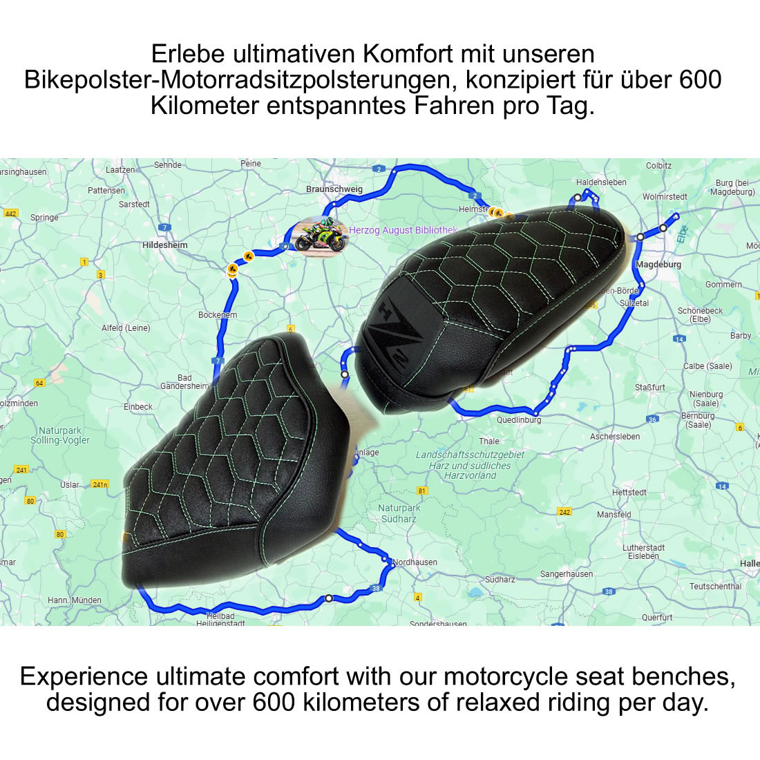 - Langstreckentauglich: Komfortpolsterung für Fahrer- und Soziussitz – ideal für über 600 km am Tag