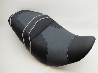 Sitzbank komplett mit einem Kunstlederbezug in Nubuck-Grau und -Schwarz neubezogen, Ziernähte, Keder in Weiß. Körperspezifische Komfortpolsterung incl. Gel-Aktivmatte und mit Lendenstützen Auf- und Umbau.