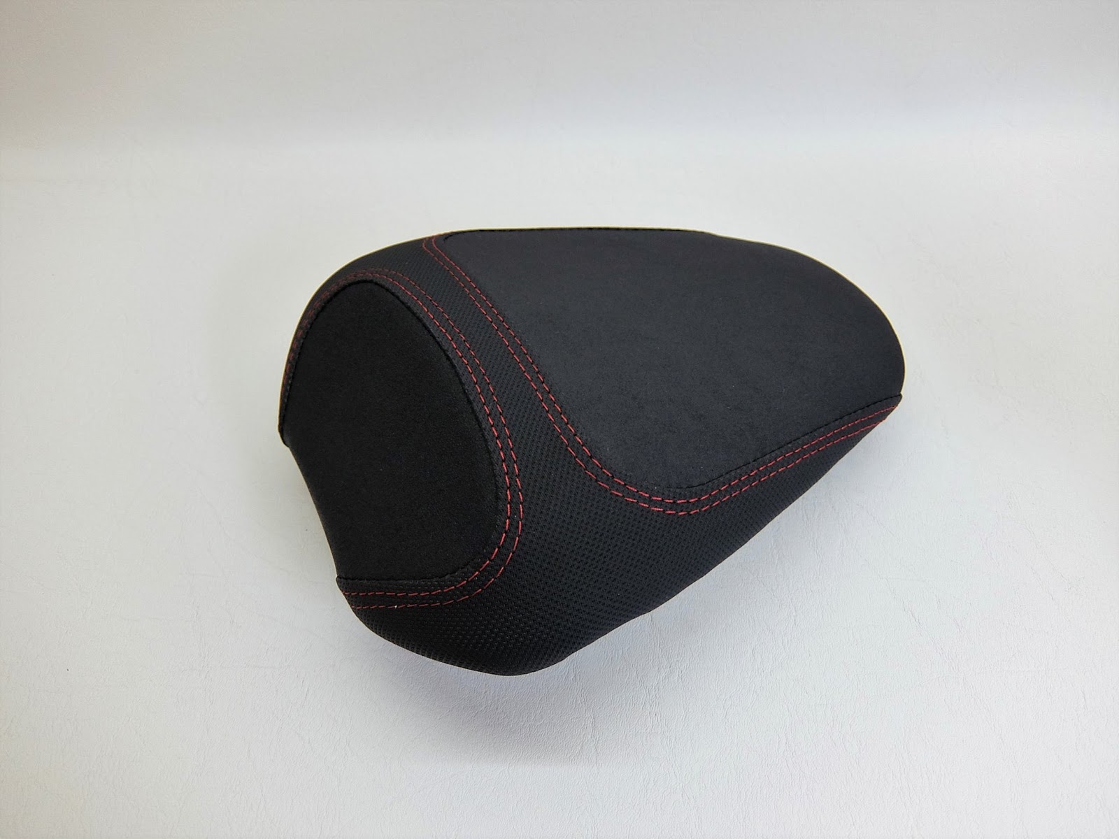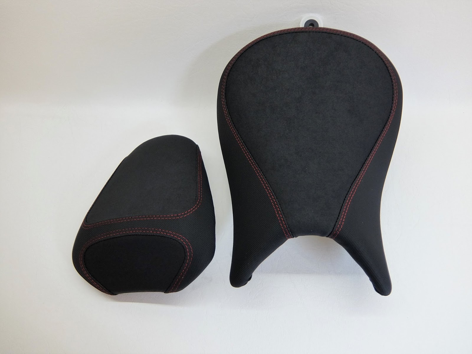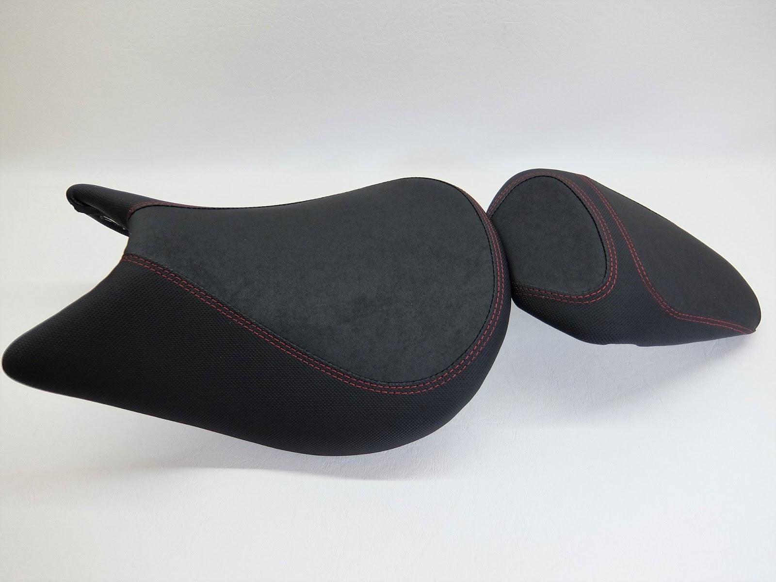 Fahrer & Soziussitz: komplette Polsterung und Neubezug in Nubuck und Antirutsch mit einer körperspezifischen Komfortpolsterung incl. Gel-Aktivmatte mit einem harten Kern, Flanken schmaler geschliffen. Doppelte Ziernaht in Rot