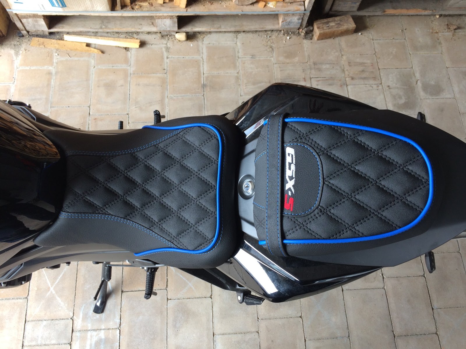 Wir haben den Fahrer- und Soziussitz komplett mit einem Neubezug in Nubuck und in Matt mit einer auf den Körper eingestellten Komfortpolsterung incl. einer Gel-Aktivmatte gepolstert. Rautensteppung mit doppelter Ziernaht in Schwarz, Ziernähte/Keder in Blau und eine Stickerei in Weiß/Rot.