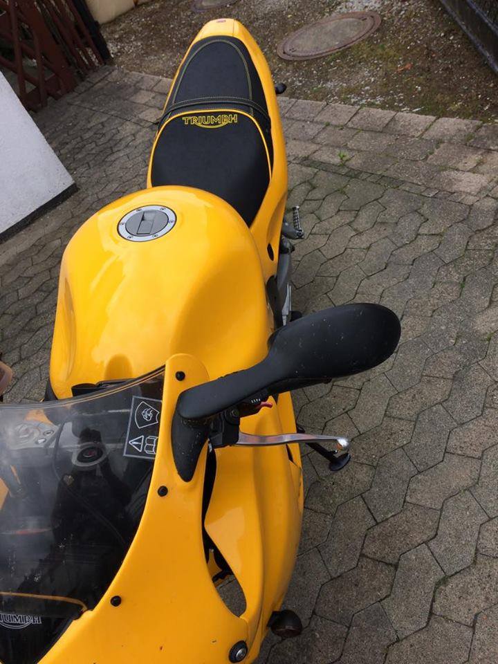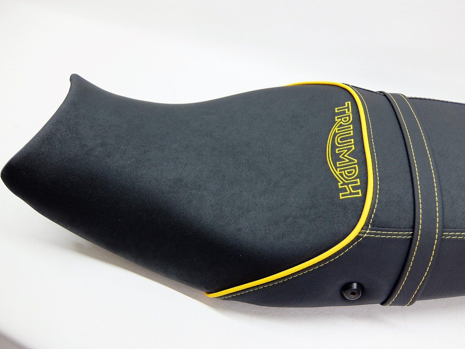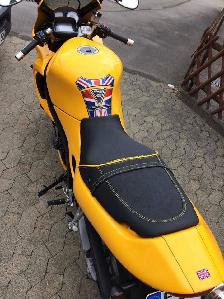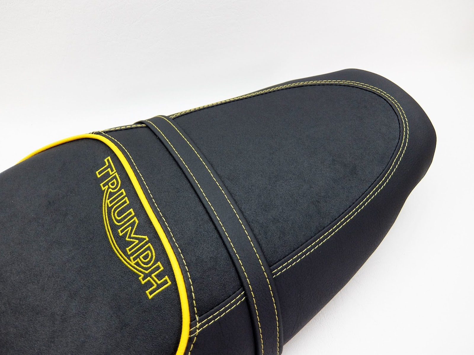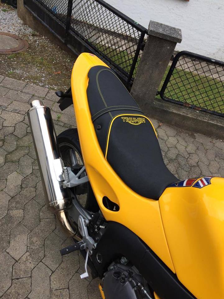 Die Sitzbank der Triumph komplett mit Nubuck und Matt neubezogen. Doppelte Ziernaht und Keder in Gelb, Stick in Outline Gelb