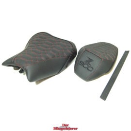 Fahrersitz in Rautensteppung mit doppelter Ziernaht und Keder in Schwarz, Sozius ohne Rautensteppung mit Stick in Rot.