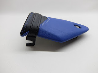 Fahrer- & Soziussitz komplett mit einem Neubezug in Alcantara-S, Carbon, Blau, Weiß und Matt bezogen. Mit einer körperspezifischen Komfortpolsterung (Gel-Aktivmatte) versehen. Wechselseitige Ziernähte und doppelte