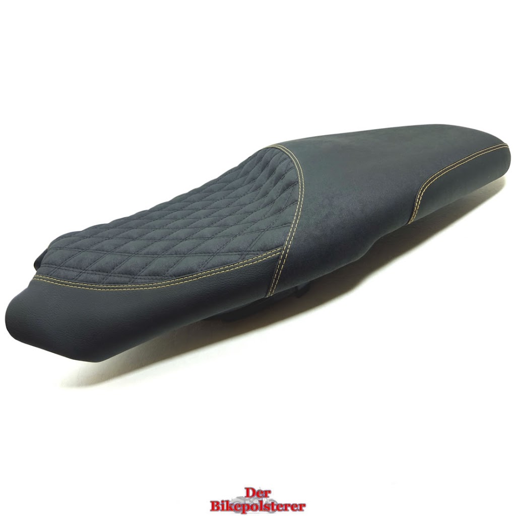 Verwandel deine Honda X-ADV Sitzbank in eine Komfortsitzbank mit Nubuk und Matt-Schwarz Bezug, Rautensteppung, goldenen Ziernähten und Tankaufrutschstop. Wir polstern deine eigene Sitzbank nach deinen Körpermaßen und Wünschen um, damit du mehr Komfort und Stil auf deinem Motorrad genießen kannst.