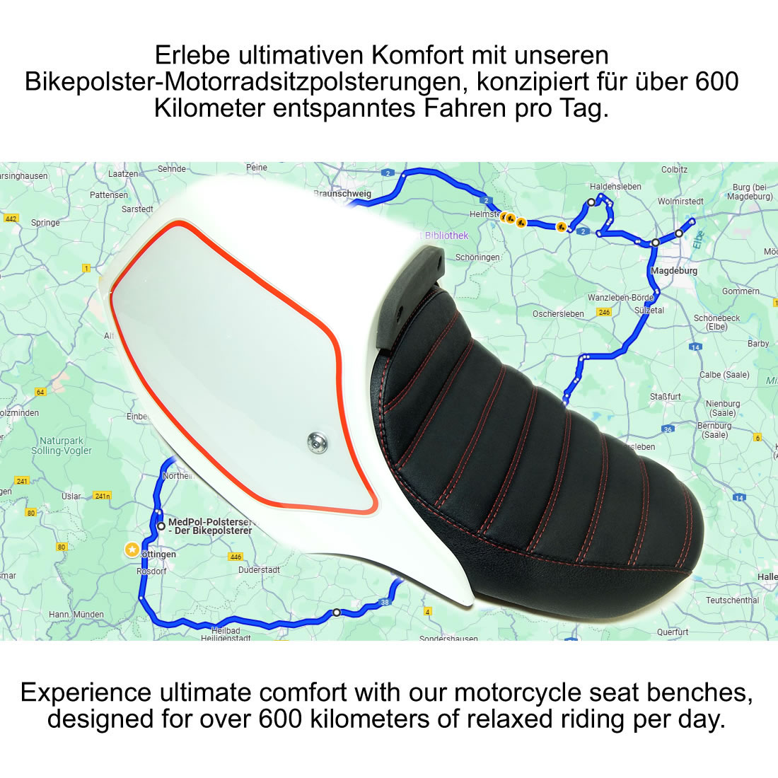 Eine ergonomisch optimierte Sitzbank sorgt dafür, dass Druckpunkte reduziert, die Sitzhöhe angepasst und die Gewichtsverteilung verbessert werden. Fahrer profitieren von einer entspannteren Haltung, weniger Ermüdung und deutlich mehr Fahrspaß – selbst auf langen Touren. Die Möglichkeit, Körpergröße und Gewicht in die Anpassung einfließen zu lassen, macht jede Sitzbank zu einem echten Unikat.