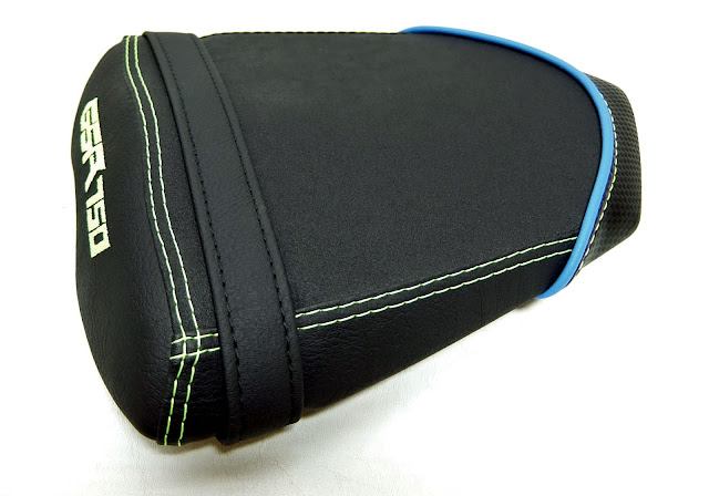 Neubezug in Nubuck/Matt/Carbon, doppelte Ziernaht/Stick in Neon-Gelb, Keder in Blau – mit Komfortpolsterung/Aktivmatte,